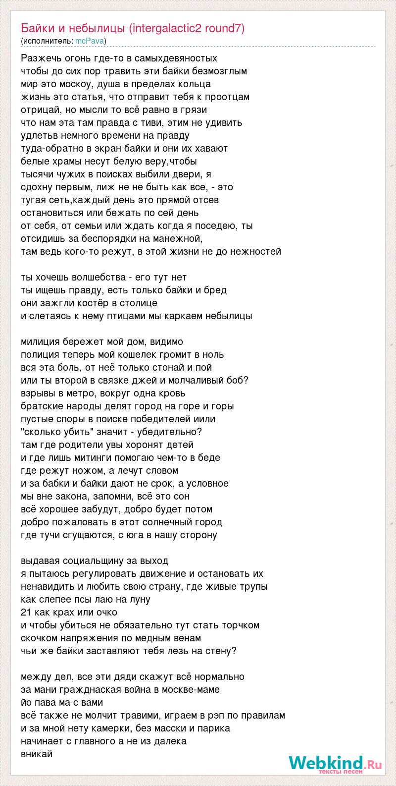Разжечь огонь где-то в самыхдевяностых чтобы до сих пор травить эти байки безмозглым мир это москоу, душа в пределах кольца жизнь это статья, что отправит тебя к проотцам отрицай, но мысли то всё равно в грязи что нам эта там правда с тиви, этим не удивить удлетьв немного времени на правду туда-обратно в экран байки и они их хавают белые храмы несут белую веру,чтобы тысячи чужих в поисках выбили двери, я сдохну первым, лиж не не быть как все, - это тугая сеть,каждый день это прямой отсев остановиться или бежать по сей день от себя, от семьи или ждать когда я поседею, ты отсидишь за беспорядки на манежной, там ведь кого-то режут, в этой жизни не до нежностей ты хочешь волшебства - его тут нет ты ищешь правду, есть только байки и бред они зажгли костёр в столице и слетаясь к нему птицами мы каркаем небылицы милиция бережет мой дом, видимо полиция теперь мой кошелек громит в ноль вся эта боль, от неё только стонай и пой или ты второй в связке джей и молчаливый боб? взрывы в метро, вокруг одна кровь братские народы делят город на горе и горы пустые споры в поиске победителей иили "сколько убить" значит - убедительно? там где родители увы хоронят детей и где лишь митинги помогаю чем-то в беде где режут ножом, а лечут словом и за бабки и байки дают не срок, а условное мы вне закона, запомни, всё это сон всё хорошее забудут, добро будет потом добро пожаловать в этот солнечный город где тучи сгущаются, с юга в нашу сторону выдавая социальщину за выход я пытаюсь регулировать движение и остановать их ненавидить и любить свою страну, где живые трупы как слепее псы лаю на луну 21 как крах или очко и чтобы убиться не обязательно тут стать торчком скочком напряжения по медным венам чьи же байки заставляют тебя лезь на стену? между дел, все эти дяди скажут всё нормально за мани гражднаская война в москве-маме йо пава ма с вами всё также не молчит травими, играем в рэп по правилам и за мной нету камерки, без масски и парика начинает с главного а не из далека вникай