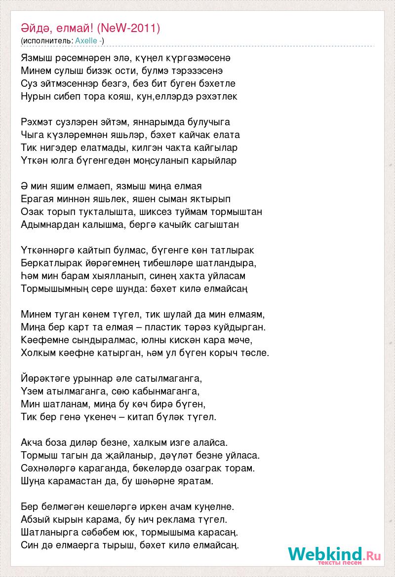 Язмыш рәсемнәрен элә, күңел күргәзмәсенә Минем сулыш бизэк ости, булмэ тэрэзэсенэ Суз эйтмэсеннэр безгэ, без бит буген бэхетле Нурын сибеп тора кояш, кун,еллэрдэ рэхэтлек Рэхмэт сузлэрен эйтэм, яннарымда булучыга Чыга күзләремнән яшьлэр, бэхет кайчак елата Тик нигэдер елатмады, килгэн чакта кайгылар Үткән юлга бүгенгедән моңсуланып карыйлар Ә мин яшим елмаеп, язмыш миңа елмая Ерагая миннән яшьлек, яшен сыман яктырып Озак торып тукталышта, шиксез туймам тормыштан Адымнардан калышма, бергә качыйк сагыштан Үткәннәргә кайтып булмас, бүгенге көн татлырак Беркатлырак йөрәгемнең тибешләре шатландыра, Һәм мин барам хыялланып, синең хакта уйласам Тормышымның сере шунда: бәхет килә елмайсаң Минем туган көнем түгел, тик шулай да мин елмаям, Миңа бер карт та елмая – пластик тәрәз куйдырган. Кәефемне сындыралмас, юлны кискән кара мәче, Холкым кәефне катырган, һәм ул бүген корыч төсле. Йөрәктәге урыннар әле сатылмаганга, Үзем атылмаганга, сөю кабынмаганга, Мин шатланам, миңа бу көч бирә бүген, Тик бер генә үкенеч – китап бүләк түгел. Акча боза диләр безне, халкым изге алайса. Тормыш тагын да җайланыр, дәүләт безне уйласа. Сәхнәләргә караганда, бөкеләрдә озаграк торам. Шуңа карамастан да, бу шәһәрне яратам. Бер белмәгән кешеләргә иркен ачам куңелне. Абзый кырын карама, бу һич реклама түгел. Шатланырга сәбәбем юк, тормышыма карасаң. Син дә елмаерга тырыш, бәхет килә елмайсаң.