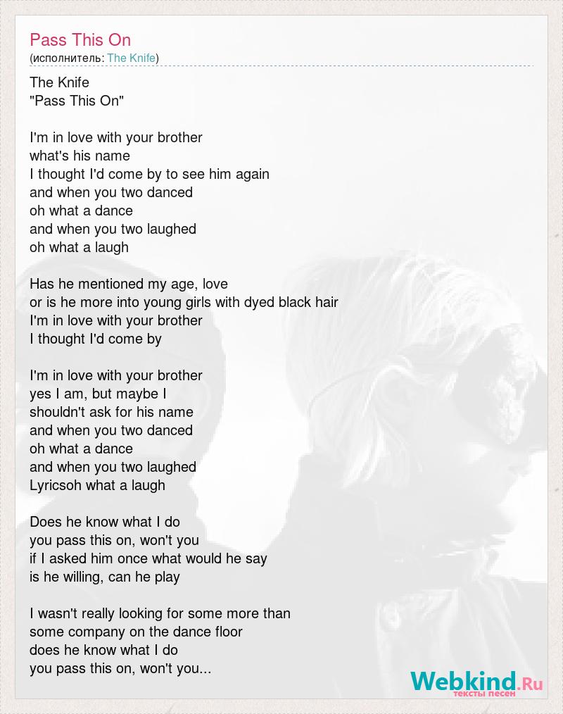 The Knife "Pass This On" I'm in love with your brother what's his name I thought I'd come by to see him again and when you two danced oh what a dance and when you two laughed oh what a laugh Has he mentioned my age, love or is he more into young girls with dyed black hair I'm in love with your brother I thought I'd come by I'm in love with your brother yes I am, but maybe I shouldn't ask for his name and when you two danced oh what a dance and when you two laughed Lyricsoh what a laugh Does he know what I do you pass this on, won't you if I asked him once what would he say is he willing, can he play I wasn't really looking for some more than some company on the dance floor does he know what I do you pass this on, won't you...