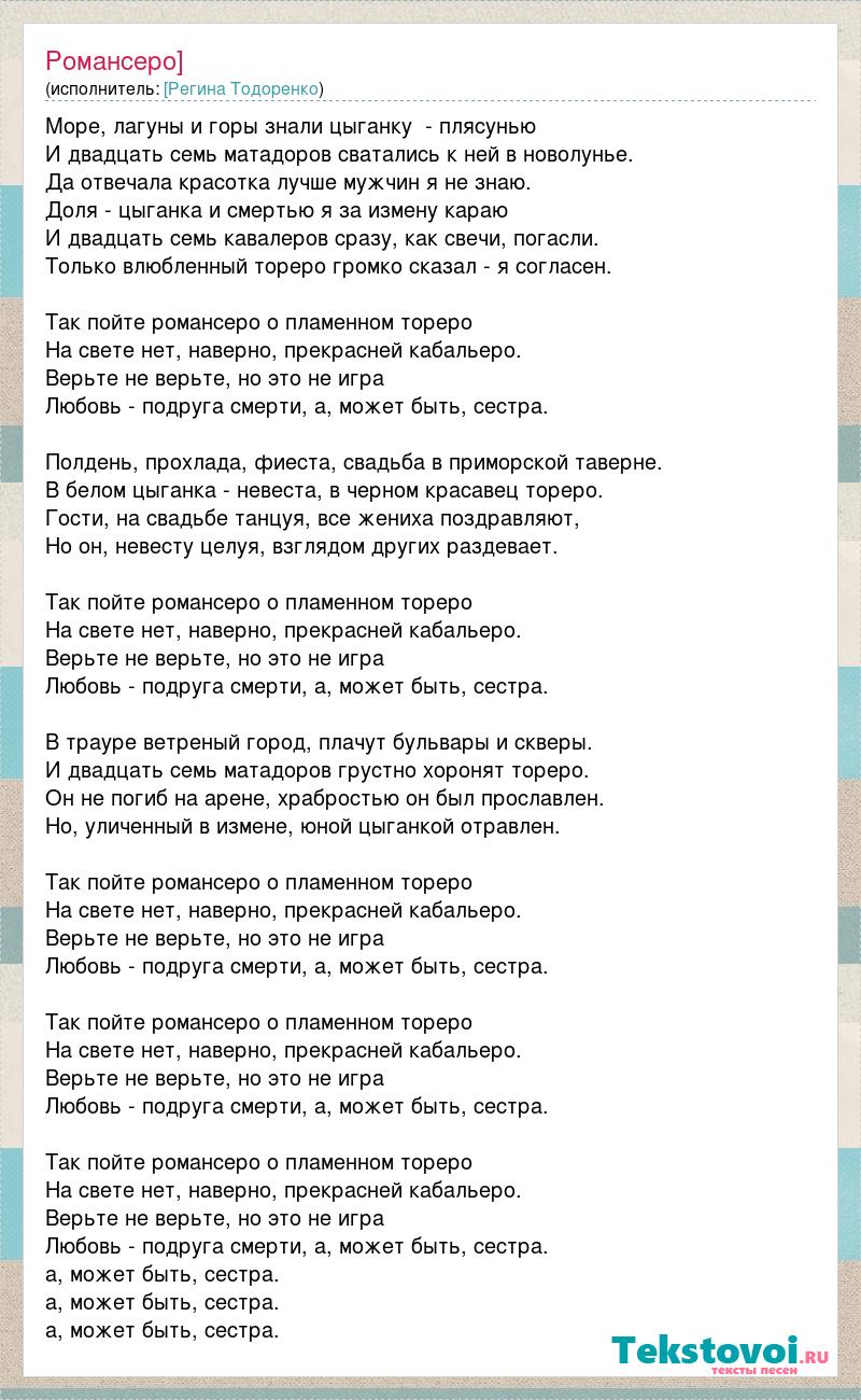 Море, лагуны и горы знали цыганку - плясунью И двадцать семь матадоров сватались к ней в новолунье. Да отвечала красотка лучше мужчин я не знаю. Доля - цыганка и смертью я за измену караю И двадцать семь кавалеров сразу, как свечи, погасли. Только влюбленный тореро громко сказал - я согласен. Так пойте романсеро о пламенном тореро На свете нет, наверно, прекрасней кабальеро. Верьте не верьте, но это не игра Любовь - подруга смерти, а, может быть, сестра. Полдень, прохлада, фиеста, свадьба в приморской таверне. В белом цыганка - невеста, в черном красавец тореро. Гости, на свадьбе танцуя, все жениха поздравляют, Но он, невесту целуя, взглядом других раздевает. Так пойте романсеро о пламенном тореро На свете нет, наверно, прекрасней кабальеро. Верьте не верьте, но это не игра Любовь - подруга смерти, а, может быть, сестра. В трауре ветреный город, плачут бульвары и скверы. И двадцать семь матадоров грустно хоронят тореро. Он не погиб на арене, храбростью он был прославлен. Но, уличенный в измене, юной цыганкой отравлен. Так пойте романсеро о пламенном тореро На свете нет, наверно, прекрасней кабальеро. Верьте не верьте, но это не игра Любовь - подруга смерти, а, может быть, сестра. Так пойте романсеро о пламенном тореро На свете нет, наверно, прекрасней кабальеро. Верьте не верьте, но это не игра Любовь - подруга смерти, а, может быть, сестра. Так пойте романсеро о пламенном тореро На свете нет, наверно, прекрасней кабальеро. Верьте не верьте, но это не игра Любовь - подруга смерти, а, может быть, сестра. а, может быть, сестра. а, может быть, сестра. а, может быть, сестра.