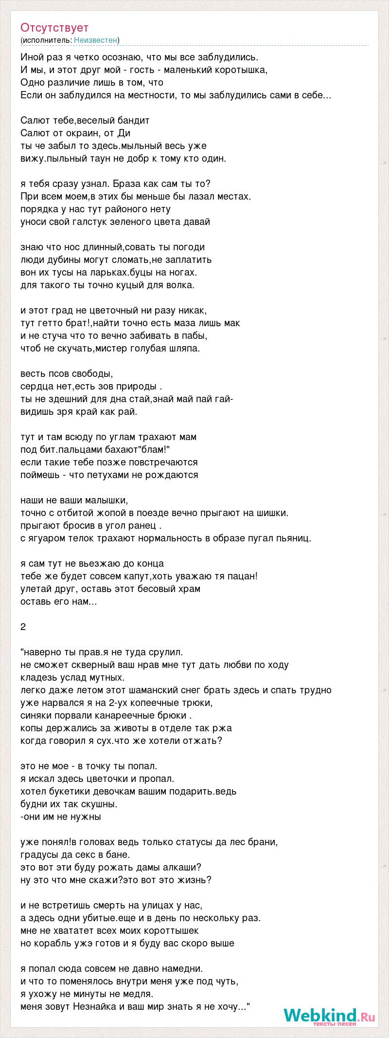 Иной раз я четко осознаю, что мы все заблудились. И мы, и этот друг мой - гость - маленький коротышка, Одно различие лишь в том, что Если он заблудился на местности, то мы заблудились сами в себе... Салют тебе,веселый бандит Салют от окраин, от Ди ты че забыл то здесь.мыльный весь уже вижу.пыльный таун не добр к тому кто один. я тебя сразу узнал. Браза как сам ты то? При всем моем,в этих бы меньше бы лазал местах. порядка у нас тут районого нету уноси свой галстук зеленого цвета давай знаю что нос длинный,совать ты погоди люди дубины могут сломать,не заплатить вон их тусы на ларьках.буцы на ногах. для такого ты точно куцый для волка. и этот град не цветочный ни разу никак, тут гетто брат!,найти точно есть маза лишь мак и не стуча что то вечно забивать в пабы, чтоб не скучать,мистер голубая шляпа. весть псов свободы, сердца нет,есть зов природы . ты не здешний для дна стай,знай май пай гай- видишь зря край как рай. тут и там всюду по углам трахают мам под бит.пальцами бахают"блам!" если такие тебе позже повстречаются поймешь - что петухами не рождаются наши не ваши малышки, точно с отбитой жопой в поезде вечно прыгают на шишки. прыгают бросив в угол ранец . с ягуаром телок трахают нормальность в образе пугал пьяниц. я сам тут не вьезжаю до конца тебе же будет совсем капут,хоть уважаю тя пацан! улетай друг, оставь этот бесовый храм оставь его нам... 2 "наверно ты прав.я не туда срулил. не сможет скверный ваш нрав мне тут дать любви по ходу кладезь услад мутных. легко даже летом этот шаманский снег брать здесь и спать трудно уже нарвался я на 2-ух копеечные трюки, синяки порвали канареечные брюки . копы держались за животы в отделе так ржа когда говорил я сух.что же хотели отжать? это не мое - в точку ты попал. я искал здесь цветочки и пропал. хотел букетики девочкам вашим подарить.ведь будни их так скушны. -они им не нужны уже понял!в головах ведь только статусы да лес брани, градусы да секс в бане. это вот эти буду рожать дамы алкаши? ну это что мне скажи?это вот это жизнь? и не встретишь смерть на улицах у нас, а здесь одни убитые.еще и в день по нескольку раз. мне не хвататет всех моих короттышек но корабль ужэ готов и я буду вас скоро выше я попал сюда совсем не давно намедни. и что то поменялось внутри меня уже под чуть, я ухожу не минуты не медля. меня зовут Незнайка и ваш мир знать я не хочу..."