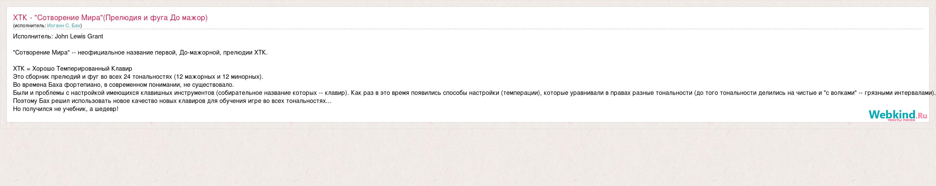 Исполнитель: John Lewis Grant "Сотворение Мира" -- неофициальное название первой, До-мажорной, прелюдии ХТК. ХТК = Хорошо Темперированный Клавир Это сборник прелюдий и фуг во всех 24 тональностях (12 мажорных и 12 минорных). Во времена Баха фортепиано, в современном понимании, не существовало. Были и проблемы с настройкой имеющихся клавишных инструментов (собирательное название которых -- клавир). Как раз в это время появились способы настройки (темперации), которые уравнивали в правах разные тональности (до того тональности делились на чистые и "с волками" -- грязными интервалами). Поэтому Бах решил использовать новое качество новых клавиров для обучения игре во всех тональностях... Но получился не учебник, а шедевр!