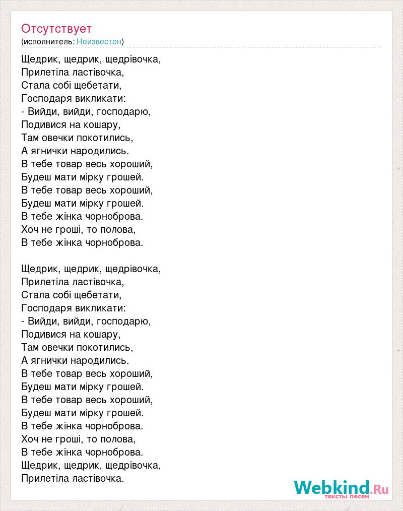 Щедрик, щедрик, щедрівочка, Прилетіла ластівочка, Стала собі щебетати, Господаря викликати: - Вийди, вийди, господарю, Подивися на кошару, Там овечки покотились, А ягнички народились. В тебе товар весь хороший, Будеш мати мірку грошей. В тебе товар весь хороший, Будеш мати мірку грошей. В тебе жінка чорноброва. Хоч не гроші, то полова, В тебе жінка чорноброва. Щедрик, щедрик, щедрівочка, Прилетіла ластівочка, Стала собі щебетати, Господаря викликати: - Вийди, вийди, господарю, Подивися на кошару, Там овечки покотились, А ягнички народились. В тебе товар весь хороший, Будеш мати мірку грошей. В тебе товар весь хороший, Будеш мати мірку грошей. В тебе жінка чорноброва. Хоч не гроші, то полова, В тебе жінка чорноброва. Щедрик, щедрик, щедрівочка, Прилетіла ластівочка.