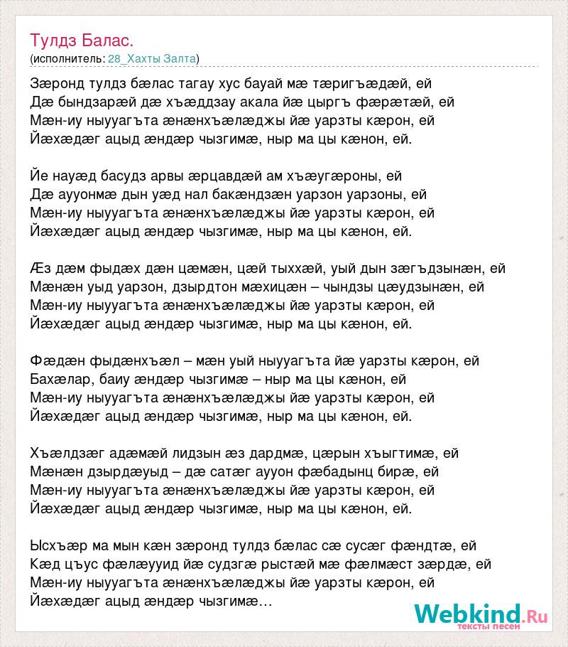 Зæронд тулдз бæлас тагау хус бауай мæ тæригъæдæй, ей Дæ бындзарæй дæ хъæддзау акала йæ цыргъ фæрæтæй, ей Мæн-иу ныууагъта æнæнхъæлæджы йæ уарзты кæрон, ей Йæхæдæг ацыд æндæр чызгимæ, ныр ма цы кæнон, ей. Йе науæд басудз арвы æрцавдæй ам хъæугæроны, ей Дæ аууонмæ дын уæд нал бакæндзæн уарзон уарзоны, ей Мæн-иу ныууагъта æнæнхъæлæджы йæ уарзты кæрон, ей Йæхæдæг ацыд æндæр чызгимæ, ныр ма цы кæнон, ей. Æз дæм фыдæх дæн цæмæн, цæй тыххæй, уый дын зæгъдзынæн, ей Мæнæн уыд уарзон, дзырдтон мæхицæн – чындзы цæудзынæн, ей Мæн-иу ныууагъта æнæнхъæлæджы йæ уарзты кæрон, ей Йæхæдæг ацыд æндæр чызгимæ, ныр ма цы кæнон, ей. Фæдæн фыдæнхъæл – мæн уый ныууагъта йæ уарзты кæрон, ей Бахæлар, баиу æндæр чызгимæ – ныр ма цы кæнон, ей Мæн-иу ныууагъта æнæнхъæлæджы йæ уарзты кæрон, ей Йæхæдæг ацыд æндæр чызгимæ, ныр ма цы кæнон, ей. Хъæлдзæг адæмæй лидзын æз дардмæ, цæрын хъыгтимæ, ей Мæнæн дзырдæуыд – дæ сатæг аууон фæбадынц бирæ, ей Мæн-иу ныууагъта æнæнхъæлæджы йæ уарзты кæрон, ей Йæхæдæг ацыд æндæр чызгимæ, ныр ма цы кæнон, ей. Ысхъæр ма мын кæн зæронд тулдз бæлас сæ сусæг фæндтæ, ей Кæд цъус фæлæууид йæ судзгæ рыстæй мæ фæлмæст зæрдæ, ей Мæн-иу ныууагъта æнæнхъæлæджы йæ уарзты кæрон, ей Йæхæдæг ацыд æндæр чызгимæ…