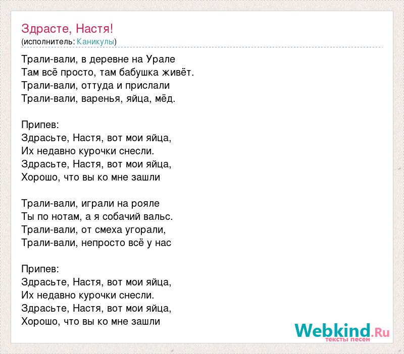 Трали-вали, в деревне на Урале Там всё просто, там бабушка живёт. Трали-вали, оттуда и прислали Трали-вали, варенья, яйца, мёд. Припев: Здрасьте, Настя, вот мои яйца, Их недавно курочки снесли. Здрасьте, Настя, вот мои яйца, Хорошо, что вы ко мне зашли Трали-вали, играли на рояле Ты по нотам, а я собачий вальс. Трали-вали, от смеха угорали, Трали-вали, непросто всё у нас Припев: Здрасьте, Настя, вот мои яйца, Их недавно курочки снесли. Здрасьте, Настя, вот мои яйца, Хорошо, что вы ко мне зашли