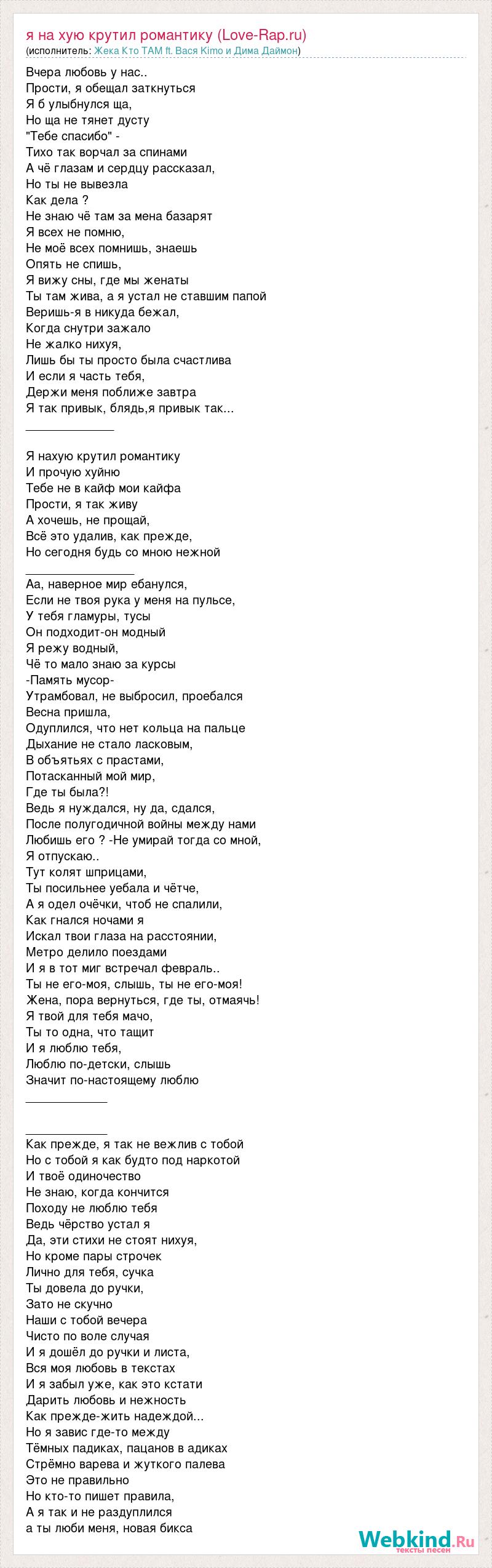Главная→Исполнители→Жека Кто ТАМ ft. Вася Kimo и Дима Даймон→Я на хую крутил романтику (Love-Rap.ru)