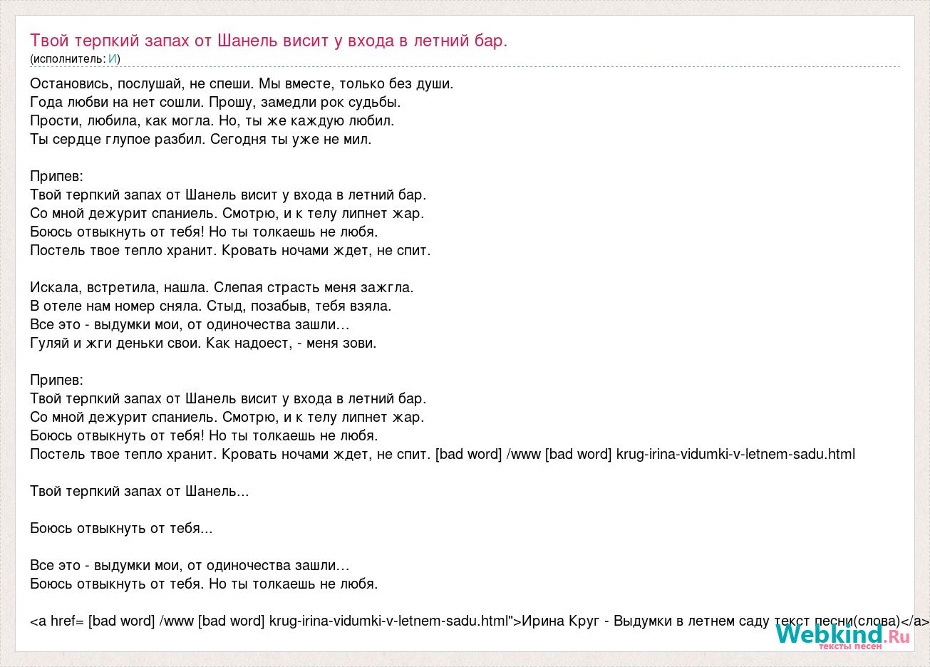 Остановись, послушай, не спеши. Мы вместе, только без души. Года любви на нет сошли. Прошу, замедли рок судьбы. Прости, любила, как могла. Но, ты же каждую любил. Ты сердце глупое разбил. Сегодня ты уже не мил. Припев: Твой терпкий запах от Шанель висит у входа в летний бар. Со мной дежурит спаниель. Смотрю, и к телу липнет жар. Боюсь отвыкнуть от тебя! Но ты толкаешь не любя. Постель твое тепло хранит. Кровать ночами ждет, не спит. Искала, встретила, нашла. Слепая страсть меня зажгла. В отеле нам номер сняла. Стыд, позабыв, тебя взяла. Все это - выдумки мои, от одиночества зашли… Гуляй и жги деньки свои. Как надоест, - меня зови. Припев: Твой терпкий запах от Шанель висит у входа в летний бар. Со мной дежурит спаниель. Смотрю, и к телу липнет жар. Боюсь отвыкнуть от тебя! Но ты толкаешь не любя. Постель твое тепло хранит. Кровать ночами ждет, не спит. [bad word] /www [bad word] krug-irina-vidumki-v-letnem-sadu.html Твой терпкий запах от Шанель... Боюсь отвыкнуть от тебя... Все это - выдумки мои, от одиночества зашли… Боюсь отвыкнуть от тебя. Но ты толкаешь не любя. <a href= [bad word] /www [bad word] krug-irina-vidumki-v-letnem-sadu.html">Ирина Круг - Выдумки в летнем саду текст песни(слова)</a>