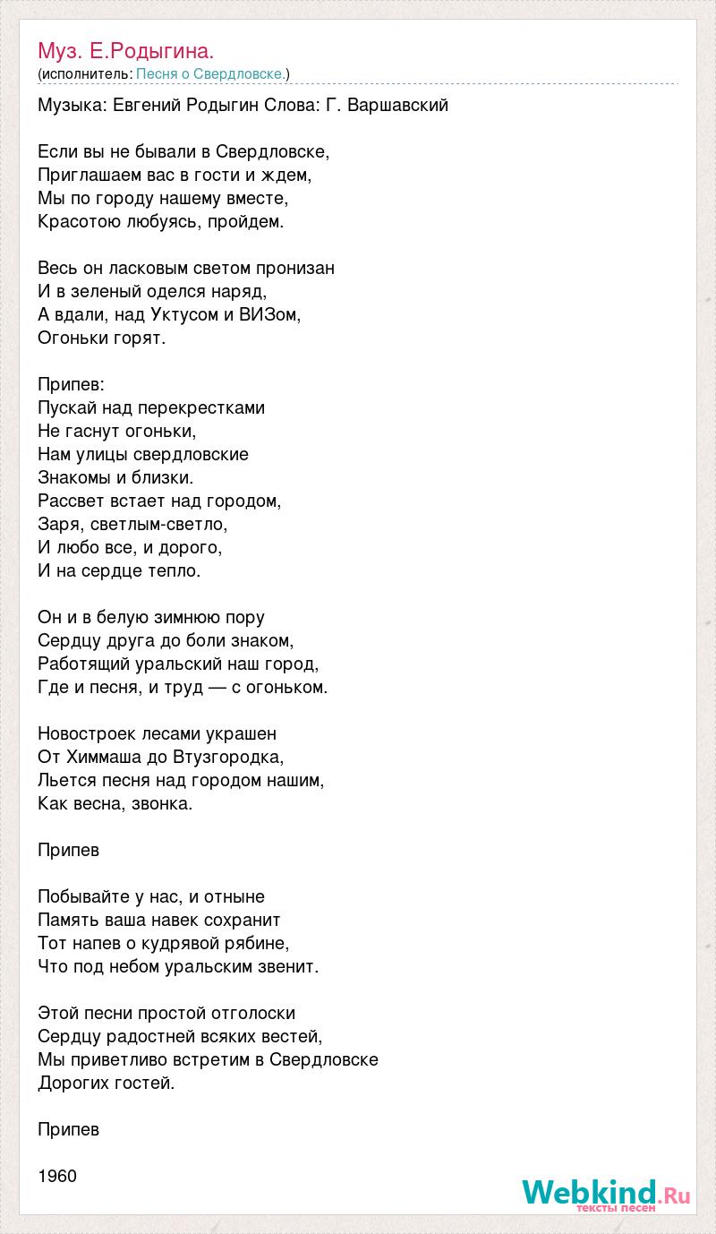 Музыка: Евгений Родыгин Слова: Г. Варшавский Если вы не бывали в Свердловске, Приглашаем вас в гости и ждем, Мы по городу нашему вместе, Красотою любуясь, пройдем. Весь он ласковым светом пронизан И в зеленый оделся наряд, А вдали, над Уктусом и ВИЗом, Огоньки горят. Припев: Пускай над перекрестками Не гаснут огоньки, Нам улицы свердловские Знакомы и близки. Рассвет встает над городом, Заря, светлым-светло, И любо все, и дорого, И на сердце тепло. Он и в белую зимнюю пору Сердцу друга до боли знаком, Работящий уральский наш город, Где и песня, и труд — с огоньком. Новостроек лесами украшен От Химмаша до Втузгородка, Льется песня над городом нашим, Как весна, звонка. Припев Побывайте у нас, и отныне Память ваша навек сохранит Тот напев о кудрявой рябине, Что под небом уральским звенит. Этой песни простой отголоски Сердцу радостней всяких вестей, Мы приветливо встретим в Свердловске Дорогих гостей. Припев 1960