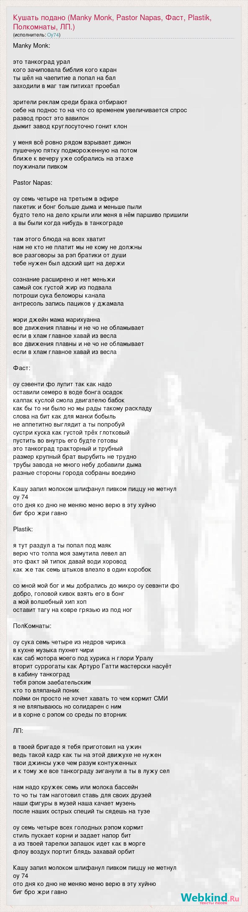 Manky Monk: это танкоград урал кого зачиповала библия кого каран ты шёл на чаепитие а попал на бал заходили в маг там питихат проебал зрители реклам среди брака отбирают себе на поднос то на что со временем увеличивается спрос развод прост это вавилон дымит завод круглосуточно гонит клон у меня всё ровно рядом взрывает димон пушечную пятку подмороженную на потом ближе к вечеру уже собрались на этаже поужинали пивком Pastor Napas: оу семь четыре на третьем в эфире пакетик и бонг больше дыма и меньше пыли будто тело на дело крыли или меня в нём паршиво пришили а вы были когда нибудь в танкограде там этого блюда на всех хватит нам не кто не платит мы не кому не должны все разговоры за рэп братики от души тебе нужен был адский щит на держи сознание расширено и нет меньжи самый сок густой жир из подвала потроши сука беломоры канала антресоль запись пациков у джамала мэри джейн мама марихуанна все движения плавны и не чо не обламывает если в хлам главное хавай из весла все движения плавны и не чо не обламывает если в хлам главное хавай из весла Фаст: оу сэвенти фо лупит так как надо оставили семеро в воде бонга осадок калпак куслой смола двигателю бабок как бы то ни было но мы рады такому раскладу слова на бит как для манки бобыль не аппетитно выглядит а ты попробуй сустри куска как густой трёх глотковый пустить во внутрь его будте готовы это танкоград тракторный и трубный размер крупный брат вырубить не трудно трубы завода не много небу добавили дыма разные стороны города собраны воедино Кашу запил молоком шлифанул пивком пиццу не метнул оу 74 ото дня ко дню не меняю меню верю в эту хуйню биг бро жри гавно Plastik: я тут раздул а ты попал под маяк верю что толпа моя замутила левел ап это факт эй типок давай води хоровод как же так семь штыков влезло в один коробок со мной мой бог и мы добрались до микро оу севэнти фо добро, головой кивок взять его в бонг а мой волшебный хип хоп оставит тагу на ковре грязью из под ног ПолКомнаты: оу сука семь четыре из недров чирика в кухне музыка пухнет чири как саб мотора моего под хурика н глори Уралу вторит суррогаты как Артуро Гатти мастерски насуёт в кабину танкоград тебя рэпом заебательским кто то вляпаный поник пойми он просто не хочет хавать то чем кормит СМИ я не вляпываюсь но солидарен с ним и в корне с рэпом со среды по вторник ЛП: в твоей бригаде я тебя приготовил на ужин ведь такой кадр как ты на этой движухе не нужен твои джинсы уже чем разум контуженных и к тому же все танкограду зиганули а ты в лужу сел нам надо кружек семь или молока бассейн то чо ты там наготовил ставь для своих друзей наши фигуры в музей наша качает музень после наших острыx специй ты сядешь на тузе оу семь четыре всех голодных рэпом кормит стиль пускает корни и задает напор бит а из твоей тарелки запашок идет как в морге флоу воздух портит блядь захавай орбит Кашу запил молоком шлифанул пивком пиццу не метнул оу 74 ото дня ко дню не меняю меню верю в эту хуйню биг бро жри гавно