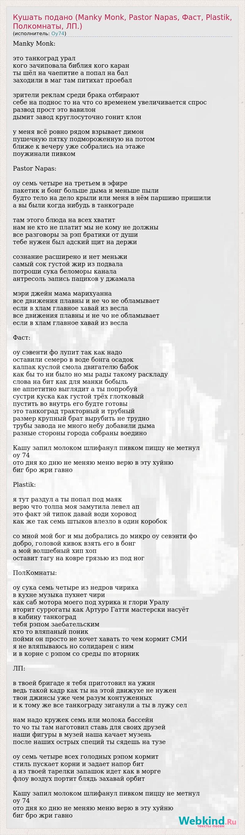 Manky Monk: это танкоград урал кого зачиповала библия кого каран ты шёл на чаепитие а попал на бал заходили в маг там питихат проебал зрители реклам среди брака отбирают себе на поднос то на что со временем увеличивается спрос развод прост это вавилон дымит завод круглосуточно гонит клон у меня всё ровно рядом взрывает димон пушечную пятку подмороженную на потом ближе к вечеру уже собрались на этаже поужинали пивком Pastor Napas: оу семь четыре на третьем в эфире пакетик и бонг больше дыма и меньше пыли будто тело на дело крыли или меня в нём паршиво пришили а вы были когда нибудь в танкограде там этого блюда на всех хватит нам не кто не платит мы не кому не должны все разговоры за рэп братики от души тебе нужен был адский щит на держи сознание расширено и нет меньжи самый сок густой жир из подвала потроши сука беломоры канала антресоль запись пациков у джамала мэри джейн мама марихуанна все движения плавны и не чо не обламывает если в хлам главное хавай из весла все движения плавны и не чо не обламывает если в хлам главное хавай из весла Фаст: оу сэвенти фо лупит так как надо оставили семеро в воде бонга осадок калпак куслой смола двигателю бабок как бы то ни было но мы рады такому раскладу слова на бит как для манки бобыль не аппетитно выглядит а ты попробуй сустри куска как густой трёх глотковый пустить во внутрь его будте готовы это танкоград тракторный и трубный размер крупный брат вырубить не трудно трубы завода не много небу добавили дыма разные стороны города собраны воедино Кашу запил молоком шлифанул пивком пиццу не метнул оу 74 ото дня ко дню не меняю меню верю в эту хуйню биг бро жри гавно Plastik: я тут раздул а ты попал под маяк верю что толпа моя замутила левел ап это факт эй типок давай води хоровод как же так семь штыков влезло в один коробок со мной мой бог и мы добрались до микро оу севэнти фо добро, головой кивок взять его в бонг а мой волшебный хип хоп оставит тагу на ковре грязью из под ног ПолКомнаты: оу сука семь четыре из недров чирика в кухне музыка пухнет чири как саб мотора моего под хурика н глори Уралу вторит суррогаты как Артуро Гатти мастерски насуёт в кабину танкоград тебя рэпом заебательским кто то вляпаный поник пойми он просто не хочет хавать то чем кормит СМИ я не вляпываюсь но солидарен с ним и в корне с рэпом со среды по вторник ЛП: в твоей бригаде я тебя приготовил на ужин ведь такой кадр как ты на этой движухе не нужен твои джинсы уже чем разум контуженных и к тому же все танкограду зиганули а ты в лужу сел нам надо кружек семь или молока бассейн то чо ты там наготовил ставь для своих друзей наши фигуры в музей наша качает музень после наших острыx специй ты сядешь на тузе оу семь четыре всех голодных рэпом кормит стиль пускает корни и задает напор бит а из твоей тарелки запашок идет как в морге флоу воздух портит блядь захавай орбит Кашу запил молоком шлифанул пивком пиццу не метнул оу 74 ото дня ко дню не меняю меню верю в эту хуйню биг бро жри гавно