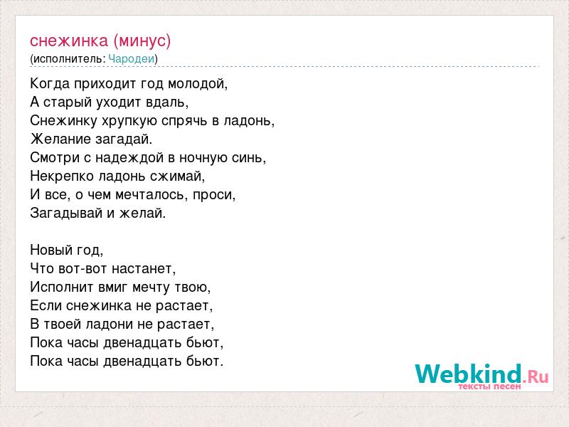 Когда приходит год молодой, А старый уходит вдаль, Снежинку хрупкую спрячь в ладонь, Желание загадай. Смотри с надеждой в ночную синь, Некрепко ладонь сжимай, И все, о чем мечталось, проси, Загадывай и желай. Новый год, Что вот-вот настанет, Исполнит вмиг мечту твою, Если снежинка не растает, В твоей ладони не растает, Пока часы двенадцать бьют, Пока часы двенадцать бьют.