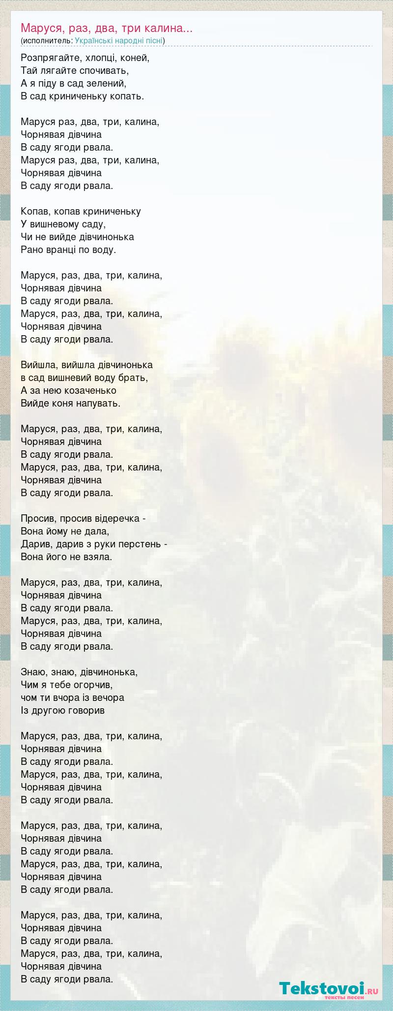 Розпрягайте, хлопцi, коней, Тай лягайте спочивать, А я пiду в сад зелений, В сад криниченьку копать. Маруся раз, два, три, калина, Чорнявая дiвчина В саду ягоди рвала. Маруся раз, два, три, калина, Чорнявая дiвчина В саду ягоди рвала. Копав, копав криниченьку У вишневому саду, Чи не вийде дiвчинонька Рано вранцi по воду. Маруся, раз, два, три, калина, Чорнявая дiвчина В саду ягоди рвала. Маруся, раз, два, три, калина, Чорнявая дiвчина В саду ягоди рвала. Вийшла, вийшла дiвчинонька в сад вишневий воду брать, А за нею козаченько Вийде коня напувать. Маруся, раз, два, три, калина, Чорнявая дiвчина В саду ягоди рвала. Маруся, раз, два, три, калина, Чорнявая дiвчина В саду ягоди рвала. Просив, просив відеречка - Вона йому не дала, Дарив, дарив з руки перстень - Вона його не взяла. Маруся, раз, два, три, калина, Чорнявая дiвчина В саду ягоди рвала. Маруся, раз, два, три, калина, Чорнявая дiвчина В саду ягоди рвала. Знаю, знаю, дiвчинонька, Чим я тебе огорчив, чом ти вчора із вечора Із другою говорив Маруся, раз, два, три, калина, Чорнявая дiвчина В саду ягоди рвала. Маруся, раз, два, три, калина, Чорнявая дiвчина В саду ягоди рвала. Маруся, раз, два, три, калина, Чорнявая дiвчина В саду ягоди рвала. Маруся, раз, два, три, калина, Чорнявая дiвчина В саду ягоди рвала. Маруся, раз, два, три, калина, Чорнявая дiвчина В саду ягоди рвала. Маруся, раз, два, три, калина, Чорнявая дiвчина В саду ягоди рвала.