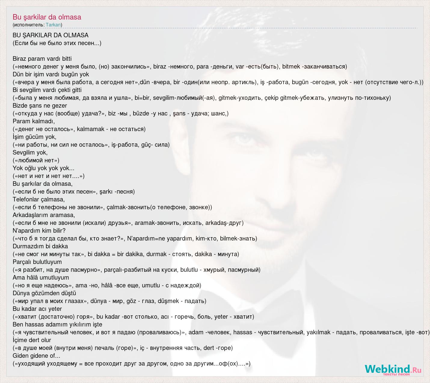 BU ŞARKILAR DA OLMASA (Если бы не было этих песен...) Biraz param vardı bitti («немного денег у меня было, (но) закончились», biraz -немного, para -деньги, var -есть(быть), bitmek -заканчиваться) Dün bir işim vardı bugün yok («вчера у меня была работа, а сегодня нет»,dün -вчера, bir -один(или неопр. артикль), iş -работа, bugün -сегодня, yok - нет (отсутствие чего-л.)) Bi sevgilim vardı çekti gitti («была у меня любимая, да взяла и ушла», bi=bir, sevgilim-любимый(-ая), gitmek-уходить, çekip gitmek-убежать, улизнуть по-тихоньку) Bizde şans ne gezer («откуда у нас (вообще) удача?», biz -мы , büzde -у нас , şans - удача; шанс,) Param kalmadı, («денег не осталось», kalmamak - не остаться) İşim gücüm yok, («ни работы, ни сил не осталось», iş-работа, güç- сила) Sevgilim yok, («любимой нет») Yok oğlu yok yok yok... («нет и нет и нет нет....») Bu şarkılar da olmasa, («если б не было этих песен», şarkı -песня) Telefonlar çalmasa, («если б телефоны не звонили», çalmak-звонить(о телефоне, звонке)) Arkadaşlarım aramasa, («если б мне не звонили (искали) друзья», aramak-звонить, искать, arkadaş-друг) N’apardım kim bilir? («что б я тогда сделал бы, кто знает?», N’apardım=ne yapardım, kim-кто, bilmek-знать) Durmazdım bi dakka («не смог ни минуты так», bi dakka = bir dakika, durmak - стоять, dakika - минута) Parçalı bulutluyum («я разбит, на душе пасмурно», parçalı-разбитый на куски, bulutlu - хмурый, пасмурный) Ama hâlâ umutluyum («но я еще надеюсь», ama -но, hâlâ -все еще, umutlu - с надеждой) Dünya gözümden düştü («мир упал в моих глазах», dünya - мир, göz - глаз, düşmek - падать) Bu kadar acı yeter («хватит (достаточно) горя», bu kadar -вот столько, acı - горечь, боль, yeter - хватит) Ben hassas adamım yıkılırım işte («я чувствительный человек, и вот я падаю (проваливаюсь)», adam -человек, hassas - чувствительный, yakılmak - падать, проваливаться, işte -вот) İçime dert olur («в душе моей (внутри меня) печаль (горе)», iç - внутренняя часть, dert -горе) Giden gidene of... («уходящий уходящему = все проходит друг за другом, одно за другим...оф(ох)....»)