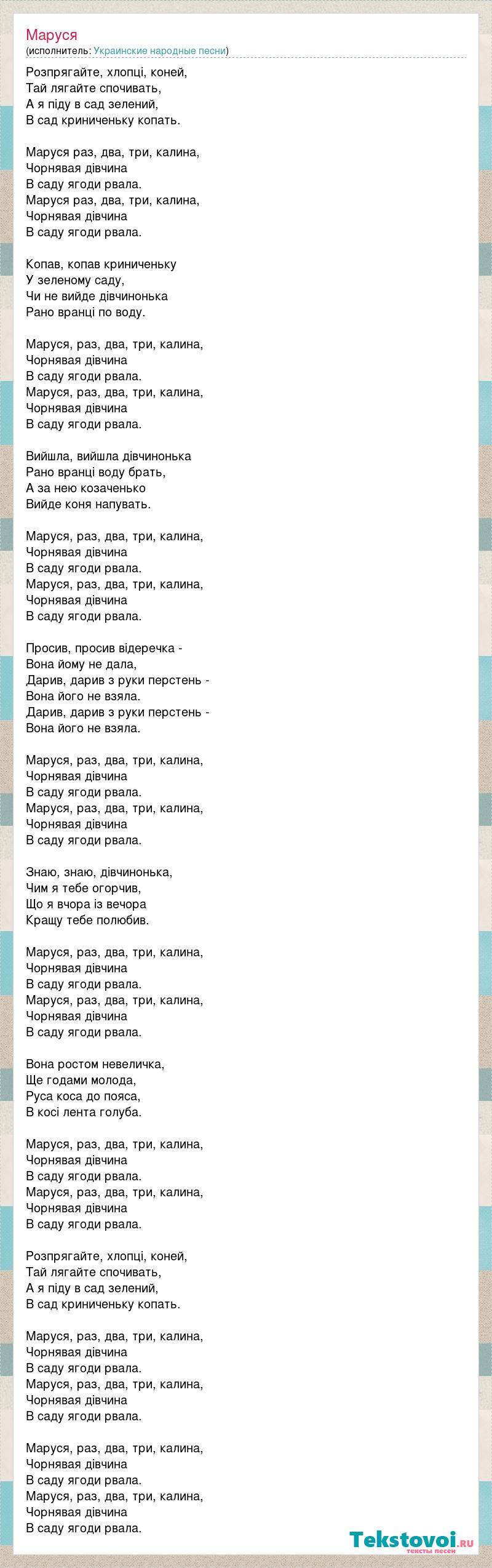 Розпрягайте, хлопцi, коней, Тай лягайте спочивать, А я пiду в сад зелений, В сад криниченьку копать. Маруся раз, два, три, калина, Чорнявая дiвчина В саду ягоди рвала. Маруся раз, два, три, калина, Чорнявая дiвчина В саду ягоди рвала. Копав, копав криниченьку У зеленому саду, Чи не вийде дiвчинонька Рано вранцi по воду. Маруся, раз, два, три, калина, Чорнявая дiвчина В саду ягоди рвала. Маруся, раз, два, три, калина, Чорнявая дiвчина В саду ягоди рвала. Вийшла, вийшла дiвчинонька Рано вранцi воду брать, А за нею козаченько Вийде коня напувать. Маруся, раз, два, три, калина, Чорнявая дiвчина В саду ягоди рвала. Маруся, раз, два, три, калина, Чорнявая дiвчина В саду ягоди рвала. Просив, просив відеречка - Вона йому не дала, Дарив, дарив з руки перстень - Вона його не взяла. Дарив, дарив з руки перстень - Вона його не взяла. Маруся, раз, два, три, калина, Чорнявая дiвчина В саду ягоди рвала. Маруся, раз, два, три, калина, Чорнявая дiвчина В саду ягоди рвала. Знаю, знаю, дiвчинонька, Чим я тебе огорчив, Що я вчора із вечора Кращу тебе полюбив. Маруся, раз, два, три, калина, Чорнявая дiвчина В саду ягоди рвала. Маруся, раз, два, три, калина, Чорнявая дiвчина В саду ягоди рвала. Вона ростом невеличка, Ще годами молода, Руса коса до пояса, В косi лента голуба. Маруся, раз, два, три, калина, Чорнявая дiвчина В саду ягоди рвала. Маруся, раз, два, три, калина, Чорнявая дiвчина В саду ягоди рвала. Розпрягайте, хлопцi, коней, Тай лягайте спочивать, А я пiду в сад зелений, В сад криниченьку копать. Маруся, раз, два, три, калина, Чорнявая дiвчина В саду ягоди рвала. Маруся, раз, два, три, калина, Чорнявая дiвчина В саду ягоди рвала. Маруся, раз, два, три, калина, Чорнявая дiвчина В саду ягоди рвала. Маруся, раз, два, три, калина, Чорнявая дiвчина В саду ягоди рвала.