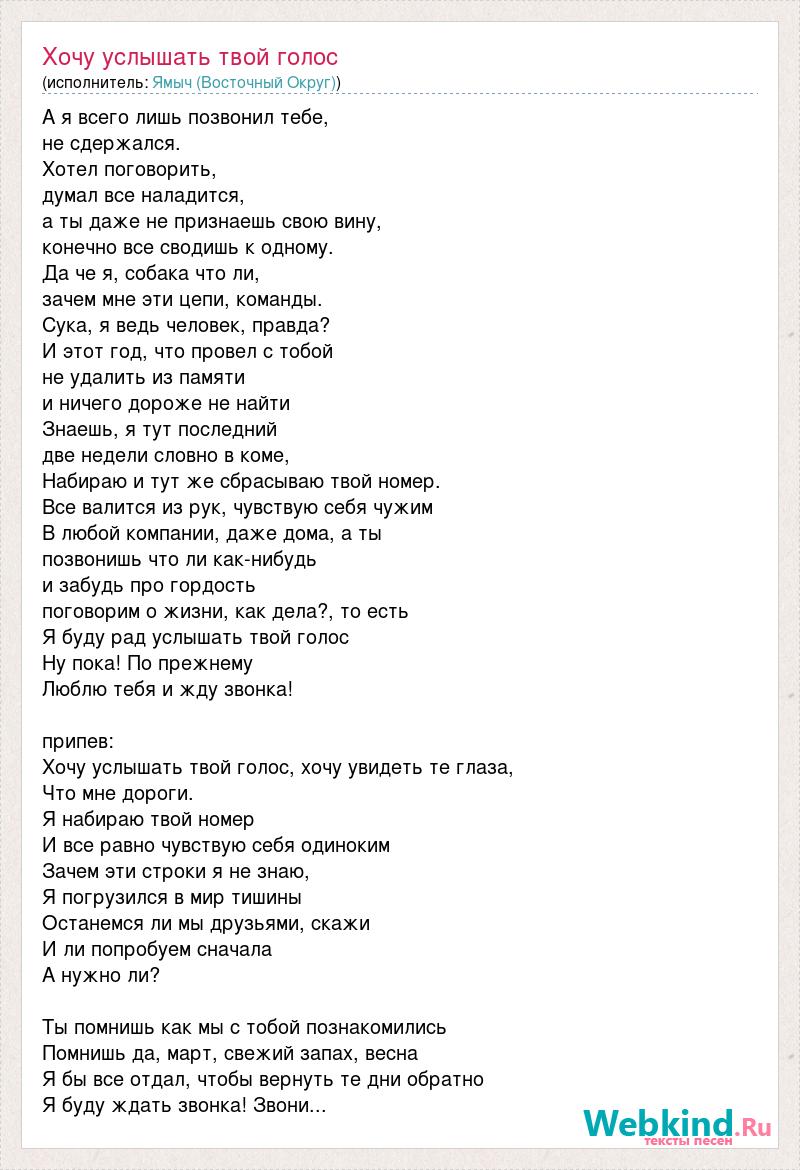 А я всего лишь позвонил тебе, не сдержался. Хотел поговорить, думал все наладится, а ты даже не признаешь свою вину, конечно все сводишь к одному. Да че я, собака что ли, зачем мне эти цепи, команды. Сука, я ведь человек, правда? И этот год, что провел с тобой не удалить из памяти и ничего дороже не найти Знаешь, я тут последний две недели словно в коме, Набираю и тут же сбрасываю твой номер. Все валится из рук, чувствую себя чужим В любой компании, даже дома, а ты позвонишь что ли как-нибудь и забудь про гордость поговорим о жизни, как дела?, то есть Я буду рад услышать твой голос Ну пока! По прежнему Люблю тебя и жду звонка! припев: Хочу услышать твой голос, хочу увидеть те глаза, Что мне дороги. Я набираю твой номер И все равно чувствую себя одиноким Зачем эти строки я не знаю, Я погрузился в мир тишины Останемся ли мы друзьями, скажи И ли попробуем сначала А нужно ли? Ты помнишь как мы с тобой познакомились Помнишь да, март, свежий запах, весна Я бы все отдал, чтобы вернуть те дни обратно Я буду ждать звонка! Звони...