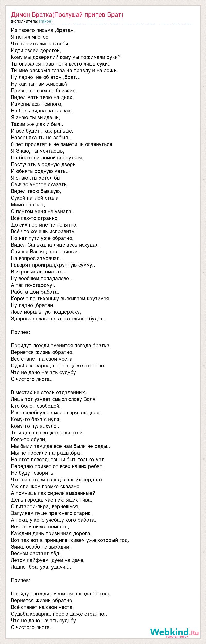 Из твоего письма ,братан, Я понял многое, Что верить лишь в себя, Идти своей дорогой, Кому мы доверяли? кому мы пожимали руки? Ты оказался прав - они всего лишь суки.. Ты мне раскрыл глаза на правду и на ложь.. Ну ладно не об этом ,брат... Ну как ты там живешь? Привет от всех,от близких.. Видел мать твою на днях, Изменилась немного, Но боль видна на глазах.. Я знаю ты выйдешь, Таким же ,как и был.. И всё будет , как раньше, Наверняка ты не забыл.. 8 лет пролетят и не заметишь оглянуться Я Знаю, ты мечтаешь, По-быстрей домой вернуться, Постучать в родную дверь И обнять родную мать.. Я знаю ,ты хотел бы Сейчас многое сказать.. Видел твою бывшую, Сукой наглой стала, Мимо прошла, С понтом меня не узнала.. Всё как-то странно, До сих пор мне не понятно, Всё что хочешь исправить, Но нет пути уже обратно, Видел Санька,на лице весь исхудал, Спился,Взгляд растеряный.. На вопрос замолчал.. Говорят проиграл,крупную сумму.. В игровых автоматах.. Ну вообщем попадалово... А так по-старому.. Работа-дом-работа, Короче по-тихоньку выживаем,крутимся, Ну ладно ,братан, Лови моральную поддержку, Здоровье-главное, а остальное будет.. Припев: Пройдут дожди,сменится погода,братка, Вернется жизнь обратно, Всё станет на свои места, Судьба коварна, порою даже странно.. Что не дано начать судьбу С чистого листа.. В местах не столь отдаленных, Лишь тот узнает смысл слову Воля, Кто болен свободой, И кто хлебнул не мало горя, эх доля.. Кому-то беха с нуля, Кому-то пуля..хуле.. То и дело в сводках новостей, Кого-то обули, Мы были там,где все нам были не рады.. Мы не просили награды,брат, На этот повседневный быт-только мат, Передаю привет от всех наших ребят, Не буду говорить, Что ты оставил след в наших сердцах, Уж слишком громко сказано, А помнишь как сидели вмазанные? День города, час-пик, ящик пива, С гитарой-лира, вернешься, Загуляем пуще прежнего,старик, А пока, у кого учеба,у кого работа, Вечером пивка немного, Каждый день привычная дорога, Вот так вот в принципе живем уже который год, Зима..особо не выходим, Весной растает лёд, Летом кайфуем, дуем на даче, Ладно ,братуха, удачи!... Припев: Пройдут дожди,сменится погода,братка, Вернется жизнь обратно, Всё станет на свои места, Судьба коварна, порою даже странно.. Что не дано начать судьбу С чистого листа..