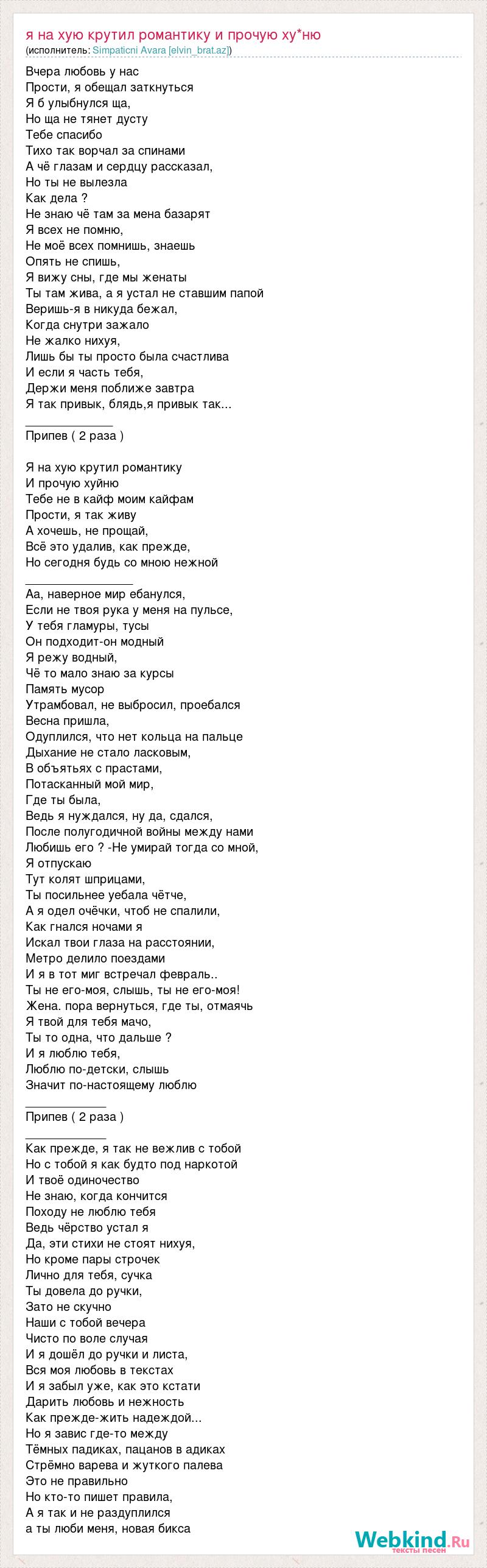 Вчера любовь у нас Прости, я обещал заткнуться Я б улыбнулся ща, Но ща не тянет дусту Тебе спасибо Тихо так ворчал за спинами А чё глазам и сердцу рассказал, Но ты не вылезла Как дела ? Не знаю чё там за мена базарят Я всех не помню, Не моё всех помнишь, знаешь Опять не спишь, Я вижу сны, где мы женаты Ты там жива, а я устал не ставшим папой Веришь-я в никуда бежал, Когда снутри зажало Не жалко нихуя, Лишь бы ты просто была счастлива И если я часть тебя, Держи меня поближе завтра Я так привык, блядь,я привык так... _____________ Припев ( 2 раза ) Я на хую крутил романтику И прочую хуйню Тебе не в кайф моим кайфам Прости, я так живу А хочешь, не прощай, Всё это удалив, как прежде, Но сегодня будь со мною нежной ________________ Аа, наверное мир ебанулся, Если не твоя рука у меня на пульсе, У тебя гламуры, тусы Он подходит-он модный Я режу водный, Чё то мало знаю за курсы Память мусор Утрамбовал, не выбросил, проебался Весна пришла, Одуплился, что нет кольца на пальце Дыхание не стало ласковым, В объятьях с прастами, Потасканный мой мир, Где ты была, Ведь я нуждался, ну да, сдался, После полугодичной войны между нами Любишь его ? -Не умирай тогда со мной, Я отпускаю Тут колят шприцами, Ты посильнее уебала чётче, А я одел очёчки, чтоб не спалили, Как гнался ночами я Искал твои глаза на расстоянии, Метро делило поездами И я в тот миг встречал февраль.. Ты не его-моя, слышь, ты не его-моя! Жена. пора вернуться, где ты, отмаячь Я твой для тебя мачо, Ты то одна, что дальше ? И я люблю тебя, Люблю по-детски, слышь Значит по-настоящему люблю ____________ Припев ( 2 раза ) ____________ Как прежде, я так не вежлив с тобой Но с тобой я как будто под наркотой И твоё одиночество Не знаю, когда кончится Походу не люблю тебя Ведь чёрство устал я Да, эти стихи не стоят нихуя, Но кроме пары строчек Лично для тебя, сучка Ты довела до ручки, Зато не скучно Наши с тобой вечера Чисто по воле случая И я дошёл до ручки и листа, Вся моя любовь в текстах И я забыл уже, как это кстати Дарить любовь и нежность Как прежде-жить надеждой... Но я завис где-то между Тёмных падиках, пацанов в адиках Стрёмно варева и жуткого палева Это не правильно Но кто-то пишет правила, А я так и не раздуплился а ты люби меня, новая бикса