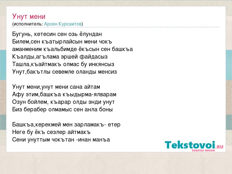 Бугунь, кетесин сен озь ёлундан Билем,сен къатырлайсын мени чокъ аманменим къальбимде ёкъсын сен башкъа Къалды,агълама эршей файдасыз Ташла,къайтмакъ олмас бу инкянсыз Унут,бакътлы севемле оланды менсиз Унут мени,унут мени сана айтам Афу этим,башкъа къыдырма-ялварам Озун бойлем, къарар олды энди унут Биз берабер олмамыс сен анла боны Башкъа,керекмей мен зарламакъ- етер Неге бу ёкъ сезлер айтмакъ Сени унуттым чокътан -инан манъа