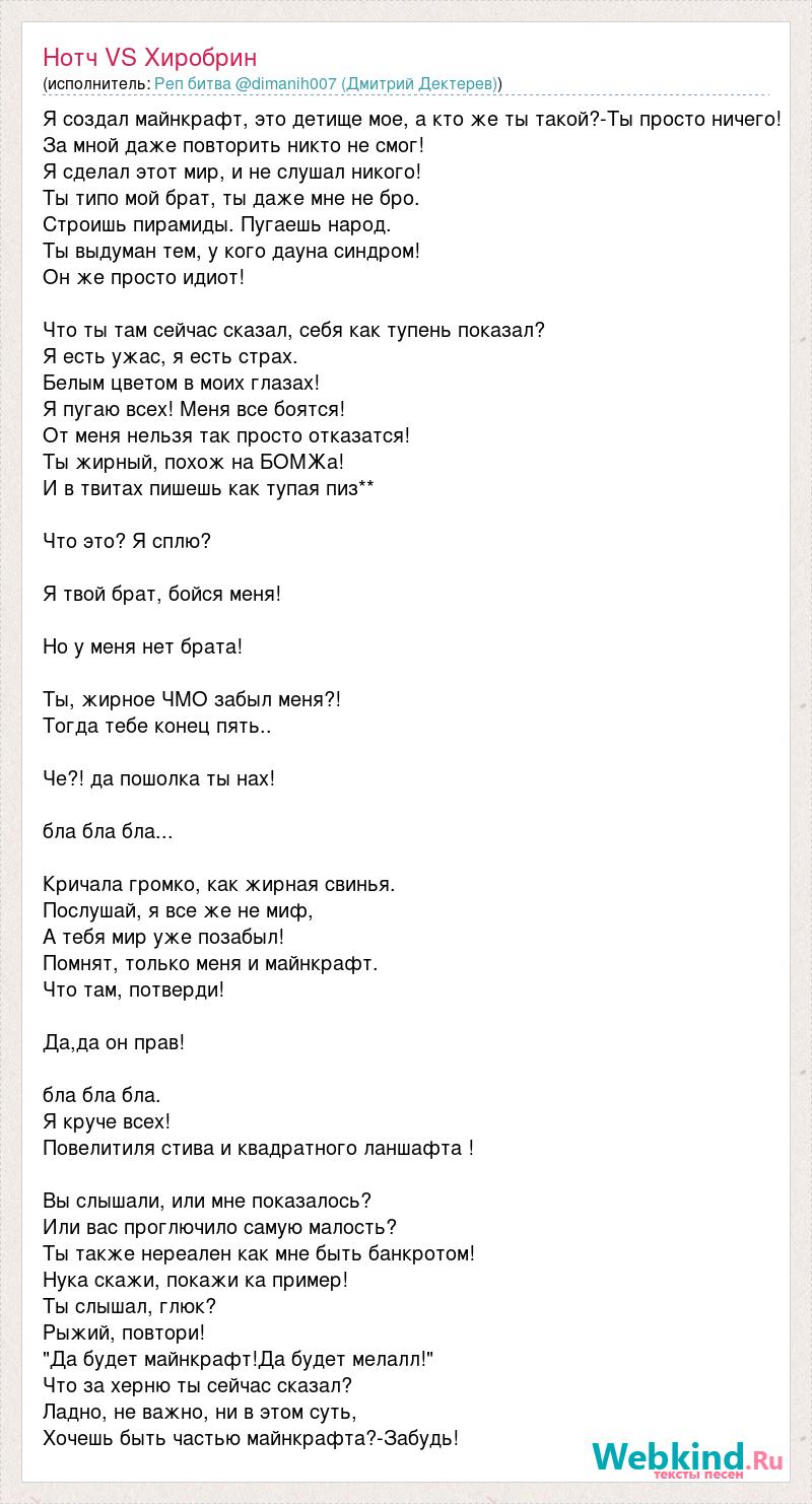 Я создал майнкрафт, это детище мое, а кто же ты такой?-Ты просто ничего! За мной даже повторить никто не смог! Я сделал этот мир, и не слушал никого! Ты типо мой брат, ты даже мне не бро. Строишь пирамиды. Пугаешь народ. Ты выдуман тем, у кого дауна синдром! Он же просто идиот! Что ты там сейчас сказал, себя как тупень показал? Я есть ужас, я есть страх. Белым цветом в моих глазах! Я пугаю всех! Меня все боятся! От меня нельзя так просто отказатся! Ты жирный, похож на БОМЖа! И в твитах пишешь как тупая пиз** Что это? Я сплю? Я твой брат, бойся меня! Но у меня нет брата! Ты, жирное ЧМО забыл меня?! Тогда тебе конец пять.. Че?! да пошолка ты нах! бла бла бла... Кричала громко, как жирная свинья. Послушай, я все же не миф, А тебя мир уже позабыл! Помнят, только меня и майнкрафт. Что там, потверди! Да,да он прав! бла бла бла. Я круче всех! Повелитиля стива и квадратного ланшафта ! Вы слышали, или мне показалось? Или вас проглючило самую малость? Ты также нереален как мне быть банкротом! Нука скажи, покажи ка пример! Ты слышал, глюк? Рыжий, повтори! "Да будет майнкрафт!Да будет мелалл!" Что за херню ты сейчас сказал? Ладно, не важно, ни в этом суть, Хочешь быть частью майнкрафта?-Забудь!