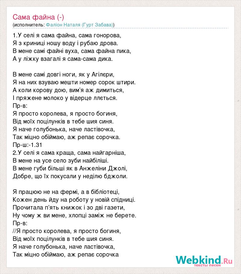 1.У селі я сама файна, сама гонорова, Я з криниці ношу воду і рубаю дрова. В мене самі файні вуха, сама файна пика, А у ліжку взагалі я сама-сама дика. В мене самі довгі ноги, як у Агілєри, Я на них взуваю мешти номер сорок штири. А коли корову дою, вим’я аж димиться, І пряжене молоко у відерце ллється. Пр-в: Я просто королева, я просто богиня, Від моїх поцілунків в тебе шия синя. Я наче голубонька, наче ластівочка, Так міцно обіймаю, аж репає сорочка. Пр-ш:-1.31 2.У селі я сама краща, сама найгарніша, В мене на усе село зуби найбіліші. В мене губи більші як в Анжеліни Джолі, Добре, що їх покусали у неділю бджоли. Я працюю не на фермі, а в бібліотеці, Кожен день йду на роботу у новій спідниці. Прочитала п’ять книжок і зо дві газети, Ну чому ж ви мене, хлопці заміж не берете. Пр-в: //Я просто королева, я просто богиня, Від моїх поцілунків в тебе шия синя. Я наче голубонька, наче ластівочка, Так міцно обіймаю, аж репає сорочка
