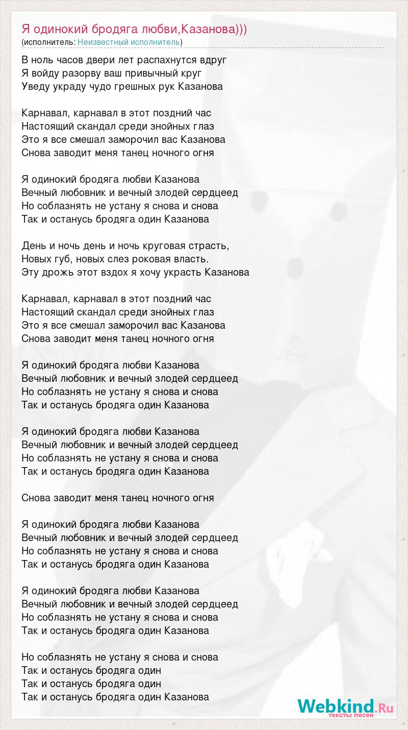 В ноль часов двери лет распахнутся вдруг Я войду разорву ваш привычный круг Уведу украду чудо грешных рук Казанова Карнавал, карнавал в этот поздний час Настоящий скандал среди знойных глаз Это я все смешал заморочил вас Казанова Снова заводит меня танец ночного огня Я одинокий бродяга любви Казанова Вечный любовник и вечный злодей сердцеед Но соблазнять не устану я снова и снова Так и останусь бродяга один Казанова День и ночь день и ночь круговая страсть, Новых губ, новых слез роковая власть. Эту дрожь этот вздох я хочу украсть Казанова Карнавал, карнавал в этот поздний час Настоящий скандал среди знойных глаз Это я все смешал заморочил вас Казанова Снова заводит меня танец ночного огня Я одинокий бродяга любви Казанова Вечный любовник и вечный злодей сердцеед Но соблазнять не устану я снова и снова Так и останусь бродяга один Казанова Я одинокий бродяга любви Казанова Вечный любовник и вечный злодей сердцеед Но соблазнять не устану я снова и снова Так и останусь бродяга один Казанова Снова заводит меня танец ночного огня Я одинокий бродяга любви Казанова Вечный любовник и вечный злодей сердцеед Но соблазнять не устану я снова и снова Так и останусь бродяга один Казанова Я одинокий бродяга любви Казанова Вечный любовник и вечный злодей сердцеед Но соблазнять не устану я снова и снова Так и останусь бродяга один Казанова Но соблазнять не устану я снова и снова Так и останусь бродяга один Так и останусь бродяга один Так и останусь бродяга один Казанова