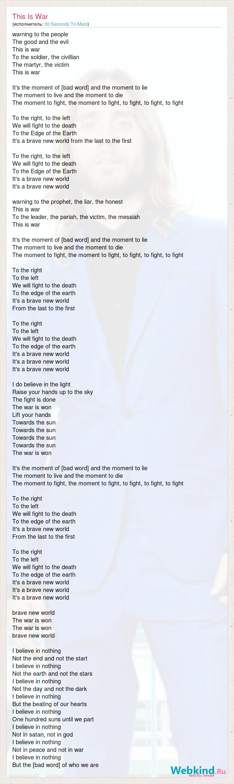 warning to the people The good and the evil This is war To the soldier, the civillian The martyr, the victim This is war It's the moment of [bad word] and the moment to lie The moment to live and the moment to die The moment to fight, the moment to fight, to fight, to fight, to fight To the right, to the left We will fight to the death To the Edge of the Earth It's a brave new world from the last to the first To the right, to the left We will fight to the death To the Edge of the Earth It's a brave new world It's a brave new world warning to the prophet, the liar, the honest This is war To the leader, the pariah, the victim, the messiah This is war It's the moment of [bad word] and the moment to lie The moment to live and the moment to die The moment to fight, the moment to fight, to fight, to fight, to fight To the right To the left We will fight to the death To the edge of the earth It's a brave new world From the last to the first To the right To the left We will fight to the death To the edge of the earth It's a brave new world It's a brave new world It's a brave new world I do believe in the light Raise your hands up to the sky The fight is done The war is won Lift your hands Towards the sun Towards the sun Towards the sun Towards the sun The war is won It's the moment of [bad word] and the moment to lie The moment to live and the moment to die The moment to fight, the moment to fight, to fight, to fight, to fight To the right To the left We will fight to the death To the edge of the earth It's a brave new world From the last to the first To the right To the left We will fight to the death To the edge of the earth It's a brave new world It's a brave new world It's a brave new world brave new world The war is won The war is won brave new world I believe in nothing Not the end and not the start I believe in nothing Not the earth and not the stars I believe in nothing Not the day and not the dark I believe in nothing But the beating of our hearts I believe in nothing One hundred suns until we part I believe in nothing Not in satan, not in god I believe in nothing Not in peace and not in war I believe in nothing But the [bad word] of who we are