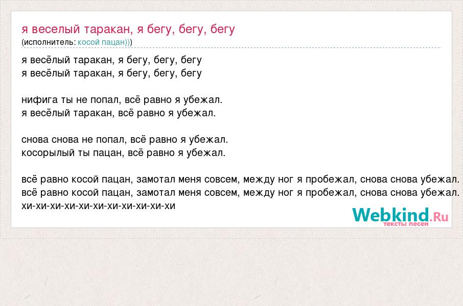 я весёлый таракан, я бегу, бегу, бегу я весёлый таракан, я бегу, бегу, бегу нифига ты не попал, всё равно я убежал. я весёлый таракан, всё равно я убежал. снова снова не попал, всё равно я убежал. косорылый ты пацан, всё равно я убежал. всё равно косой пацан, замотал меня совсем, между ног я пробежал, снова снова убежал. всё равно косой пацан, замотал меня совсем, между ног я пробежал, снова снова убежал. хи-хи-хи-хи-хи-хи-хи-хи-хи-хи-хи