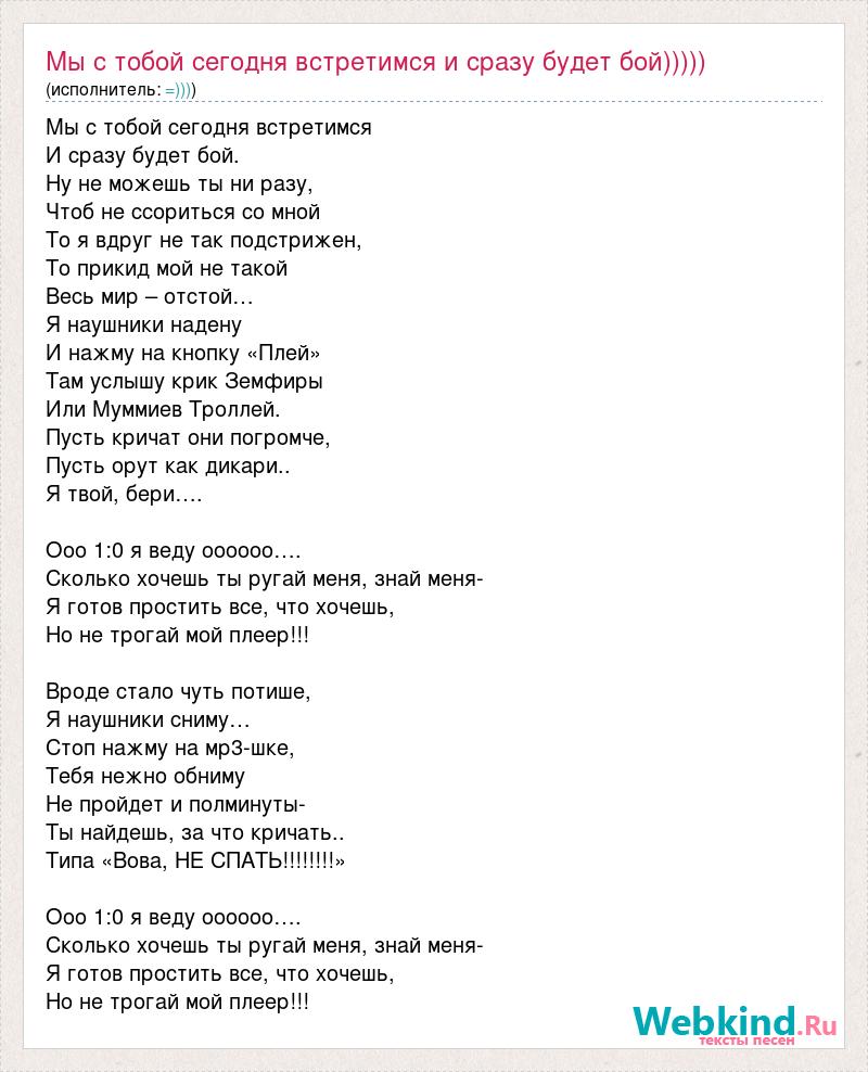 Мы с тобой сегодня встретимся И сразу будет бой. Ну не можешь ты ни разу, Чтоб не ссориться со мной То я вдруг не так подстрижен, То прикид мой не такой Весь мир – отстой… Я наушники надену И нажму на кнопку «Плей» Там услышу крик Земфиры Или Муммиев Троллей. Пусть кричат они погромче, Пусть орут как дикари.. Я твой, бери…. Ооо 1:0 я веду оооооо…. Сколько хочешь ты ругай меня, знай меня- Я готов простить все, что хочешь, Но не трогай мой плеер!!! Вроде стало чуть потише, Я наушники сниму… Стоп нажму на мр3-шке, Тебя нежно обниму Не пройдет и полминуты- Ты найдешь, за что кричать.. Типа «Вова, НЕ СПАТЬ!!!!!!!!» Ооо 1:0 я веду оооооо…. Сколько хочешь ты ругай меня, знай меня- Я готов простить все, что хочешь, Но не трогай мой плеер!!!