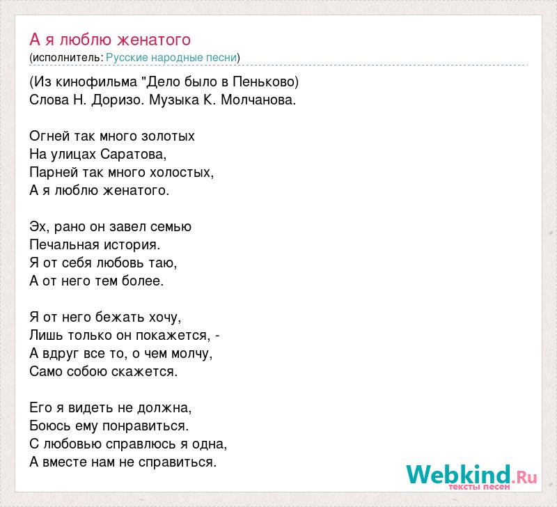 (Из кинофильма "Дело было в Пеньково) Слова Н. Доризо. Музыка К. Молчанова. Огней так много золотых На улицах Саратова, Парней так много холостых, А я люблю женатого. Эх, рано он завел семью Печальная история. Я от себя любовь таю, А от него тем более. Я от него бежать хочу, Лишь только он покажется, - А вдруг все то, о чем молчу, Само собою скажется. Его я видеть не должна, Боюсь ему понравиться. С любовью справлюсь я одна, А вместе нам не справиться.