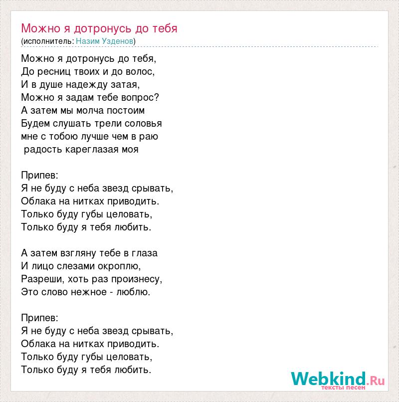 Можно я дотронусь до тебя, До ресниц твоих и до волос, И в душе надежду затая, Можно я задам тебе вопрос? А затем мы молча постоим Будем слушать трели соловья мне с тобою лучше чем в раю радость кареглазая моя Припев: Я не буду с неба звезд срывать, Облака на нитках приводить. Только буду губы целовать, Только буду я тебя любить. А затем взгляну тебе в глаза И лицо слезами окроплю, Разреши, хоть раз произнесу, Это слово нежное - люблю. Припев: Я не буду с неба звезд срывать, Облака на нитках приводить. Только буду губы целовать, Только буду я тебя любить.