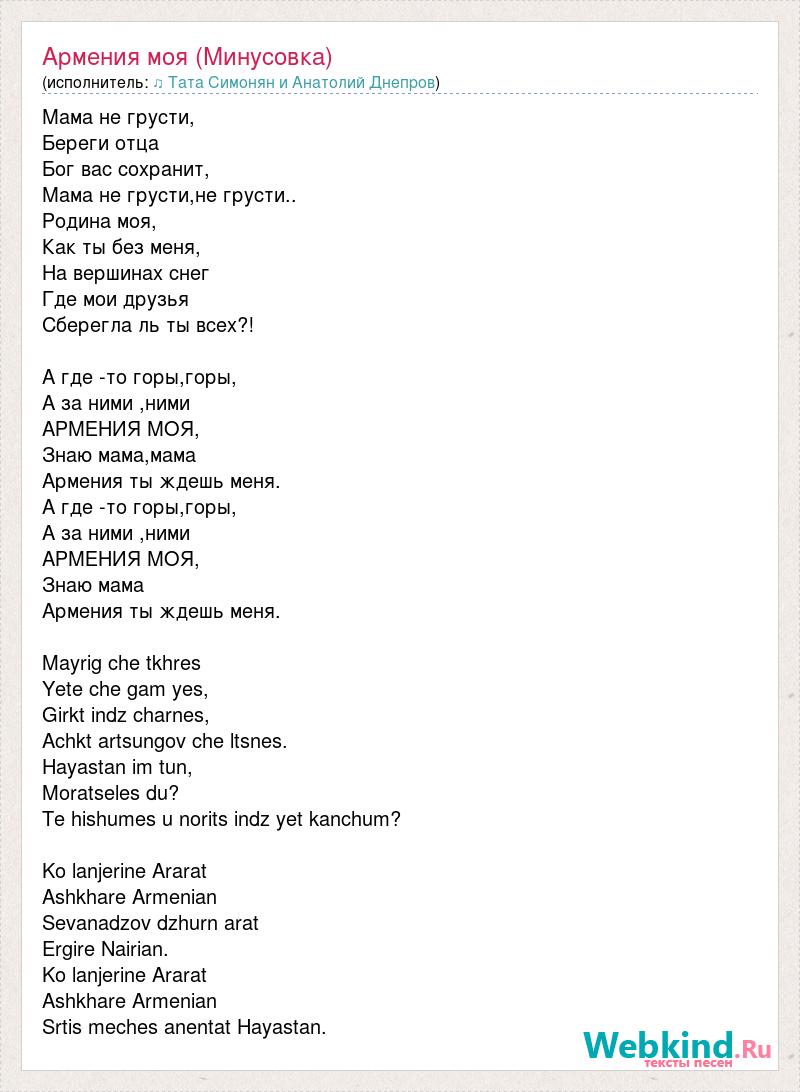 Мама не грусти, Береги отца Бог вас сохранит, Мама не грусти,не грусти.. Родина моя, Как ты без меня, На вершинах снег Где мои друзья Сберегла ль ты всех?! А где -то горы,горы, А за ними ,ними АРМЕНИЯ МОЯ, Знаю мама,мама Армения ты ждешь меня. А где -то горы,горы, А за ними ,ними АРМЕНИЯ МОЯ, Знаю мама Армения ты ждешь меня. Mayrig che tkhres Yete che gam yes, Girkt indz charnes, Achkt artsungov che ltsnes. Hayastan im tun, Moratseles du? Te hishumes u norits indz yet kanchum? Ko lanjerine Ararat Ashkhare Armenian Sevanadzov dzhurn arat Ergire Nairian. Ko lanjerine Ararat Ashkhare Armenian Srtis meches anentat Hayastan.