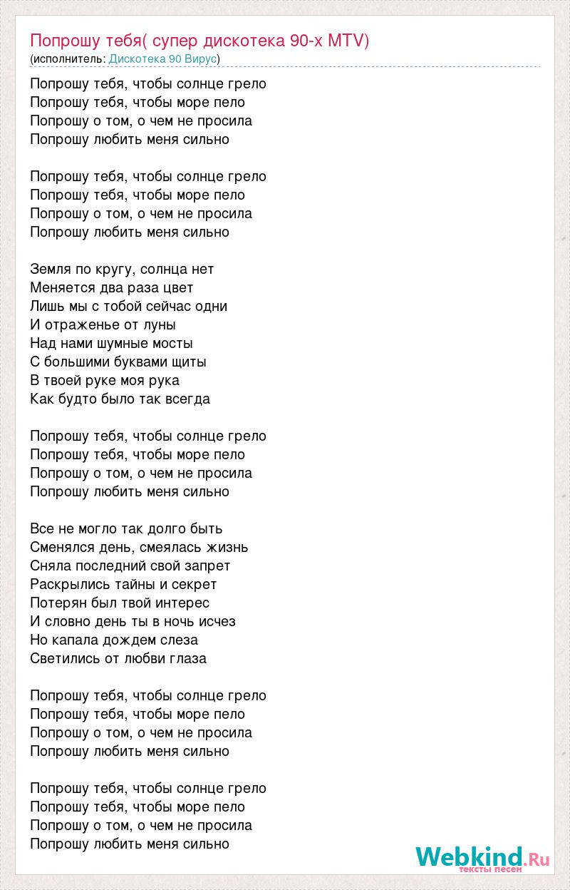 Попрошу тебя, чтобы солнце грело Попрошу тебя, чтобы море пело Попрошу о том, о чем не просила Попрошу любить меня сильно Попрошу тебя, чтобы солнце грело Попрошу тебя, чтобы море пело Попрошу о том, о чем не просила Попрошу любить меня сильно Земля по кругу, солнца нет Меняется два раза цвет Лишь мы с тобой сейчас одни И отраженье от луны Над нами шумные мосты С большими буквами щиты В твоей руке моя рука Как будто было так всегда Попрошу тебя, чтобы солнце грело Попрошу тебя, чтобы море пело Попрошу о том, о чем не просила Попрошу любить меня сильно Все не могло так долго быть Сменялся день, смеялась жизнь Сняла последний свой запрет Раскрылись тайны и секрет Потерян был твой интерес И словно день ты в ночь исчез Но капала дождем слеза Светились от любви глаза Попрошу тебя, чтобы солнце грело Попрошу тебя, чтобы море пело Попрошу о том, о чем не просила Попрошу любить меня сильно Попрошу тебя, чтобы солнце грело Попрошу тебя, чтобы море пело Попрошу о том, о чем не просила Попрошу любить меня сильно