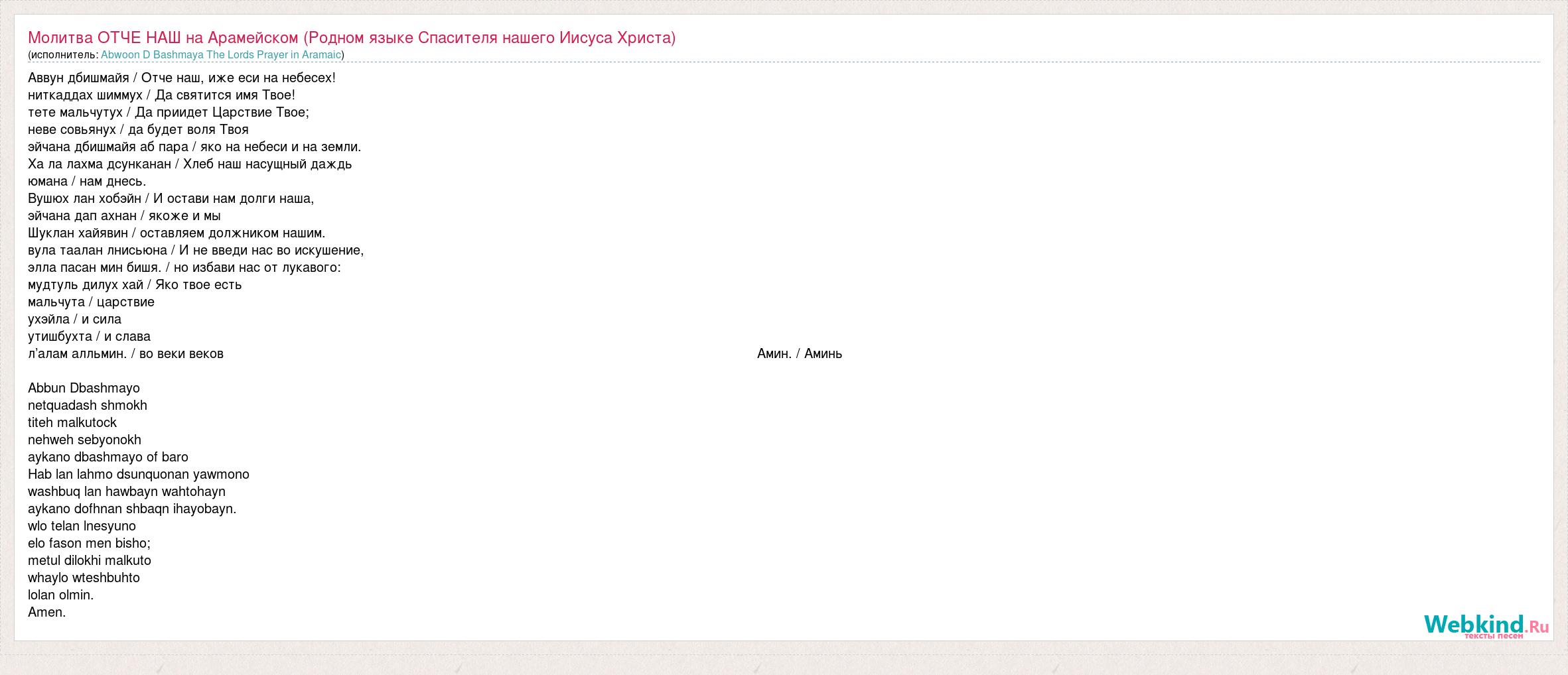 Главная→Исполнители→Abwoon D Bashmaya The Lords Prayer in Aramaic→Молитва ОТЧЕ НАШ на Арамейском (Родном языке Спасителя нашего Иисуса Х