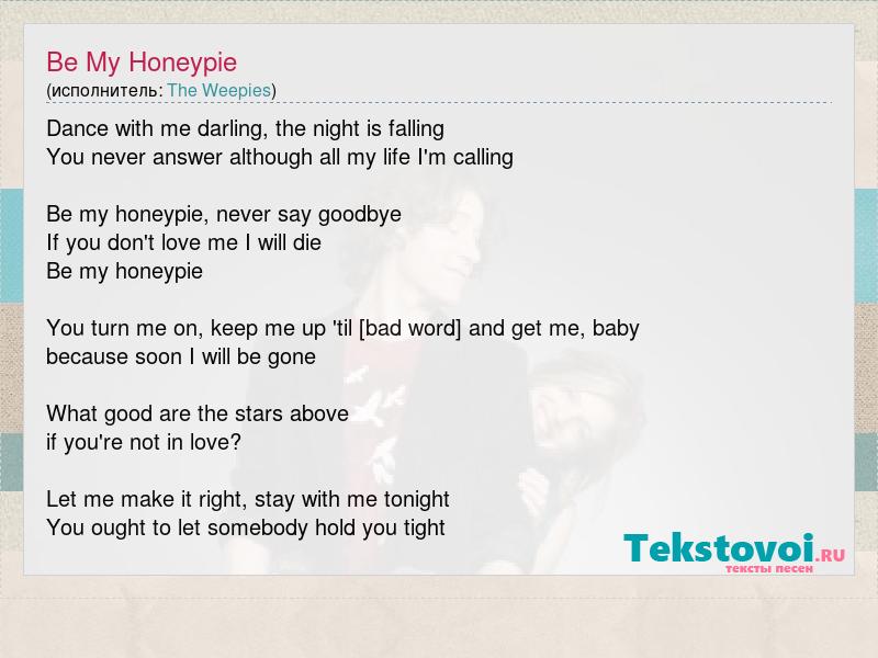 Dance with me darling, the night is falling You never answer although all my life I'm calling Be my honeypie, never say goodbye If you don't love me I will die Be my honeypie You turn me on, keep me up 'til [bad word] and get me, baby because soon I will be gone What good are the stars above if you're not in love? Let me make it right, stay with me tonight You ought to let somebody hold you tight