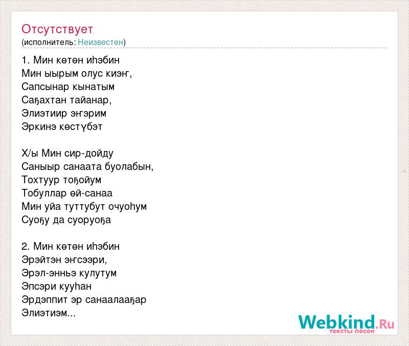 1. Мин көтөн иhэбин Мин ыырым олус киэҥ, Сапсынар кынатым Саҕахтан тайанар, Элиэтиир эҥэрим Эркинэ көстүбэт Х/ы Мин сир-дойду Саныыр санаата буолабын, Тохтуур тоҕойум Тобуллар өй-санаа Мин уйа туттубут очуоhум Суоҕу да суоруоҕа 2. Мин көтөн иhэбин Эрэйтэн эҥсээри, Эрэл-энньэ кулутум Эпсэри кууhан Эрдэппит эр санаалааҕар Элиэтиэм...