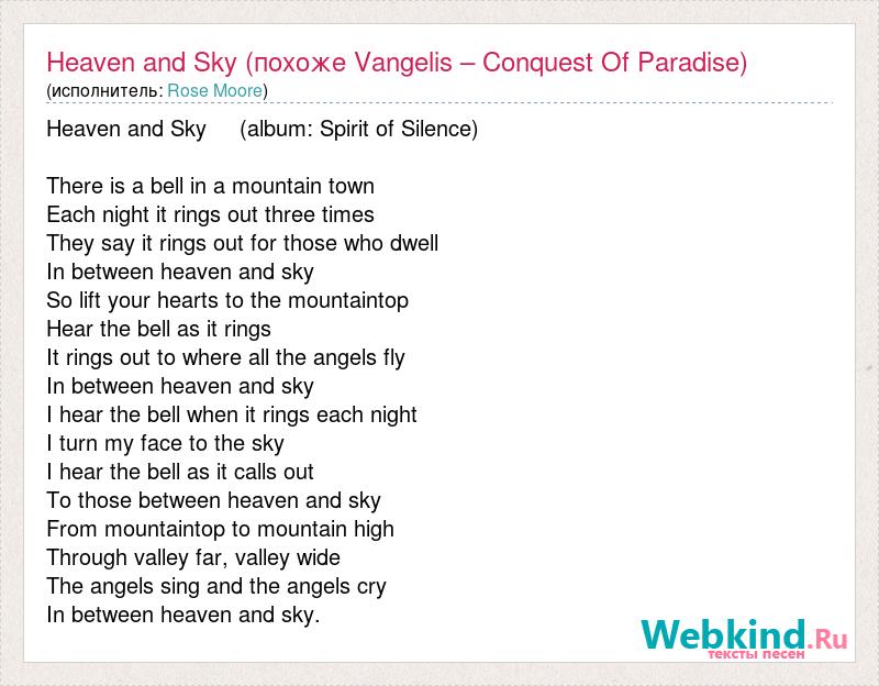 Heaven and Sky (album: Spirit of Silence) There is a bell in a mountain town Each night it rings out three times They say it rings out for those who dwell In between heaven and sky So lift your hearts to the mountaintop Hear the bell as it rings It rings out to where all the angels fly In between heaven and sky I hear the bell when it rings each night I turn my face to the sky I hear the bell as it calls out To those between heaven and sky From mountaintop to mountain high Through valley far, valley wide The angels sing and the angels cry In between heaven and sky.