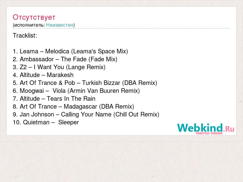 Tracklist: 1. Leama – Melodica (Leama's Space Mix) 2. Ambassador – The Fade (Fade Mix) 3. Z2 – I Want You (Lange Remix) 4. Altitude – Marakesh 5. Art Of Trance & Pob – Turkish Bizzar (DBA Remix) 6. Moogwai – Viola (Armin Van Buuren Remix) 7. Altitude – Tears In The Rain 8. Art Of Trance – Madagascar (DBA Remix) 9. Jan Johnson – Calling Your Name (Chill Out Remix) 10. Quietman – Sleeper