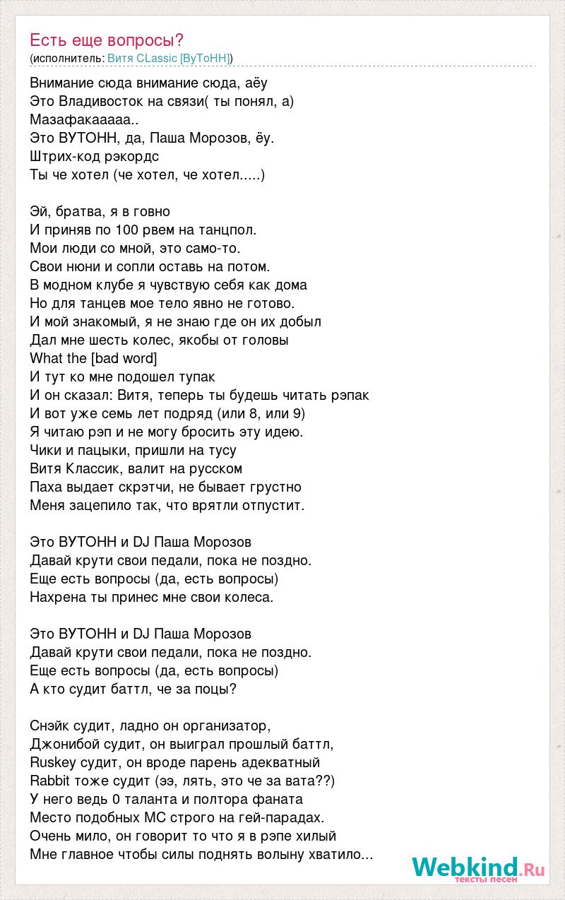 Внимание сюда внимание сюда, аёу Это Владивосток на связи( ты понял, а) Мазафакааааа.. Это ВУТОНН, да, Паша Морозов, ёу. Штрих-код рэкордс Ты че хотел (че хотел, че хотел.....) Эй, братва, я в говно И приняв по 100 рвем на танцпол. Мои люди со мной, это само-то. Свои нюни и сопли оставь на потом. В модном клубе я чувствую себя как дома Но для танцев мое тело явно не готово. И мой знакомый, я не знаю где он их добыл Дал мне шесть колес, якобы от головы What the [bad word] И тут ко мне подошел тупак И он сказал: Витя, теперь ты будешь читать рэпак И вот уже семь лет подряд (или 8, или 9) Я читаю рэп и не могу бросить эту идею. Чики и пацыки, пришли на тусу Витя Классик, валит на русском Паха выдает скрэтчи, не бывает грустно Меня зацепило так, что врятли отпустит. Это ВУТОНН и DJ Паша Морозов Давай крути свои педали, пока не поздно. Еще есть вопросы (да, есть вопросы) Нахрена ты принес мне свои колеса. Это ВУТОНН и DJ Паша Морозов Давай крути свои педали, пока не поздно. Еще есть вопросы (да, есть вопросы) А кто судит баттл, че за поцы? Снэйк судит, ладно он организатор, Джонибой судит, он выиграл прошлый баттл, Ruskey судит, он вроде парень адекватный Rabbit тоже судит (ээ, лять, это че за вата??) У него ведь 0 таланта и полтора фаната Место подобных МС строго на гей-парадах. Очень мило, он говорит то что я в рэпе хилый Мне главное чтобы силы поднять волыну хватило...