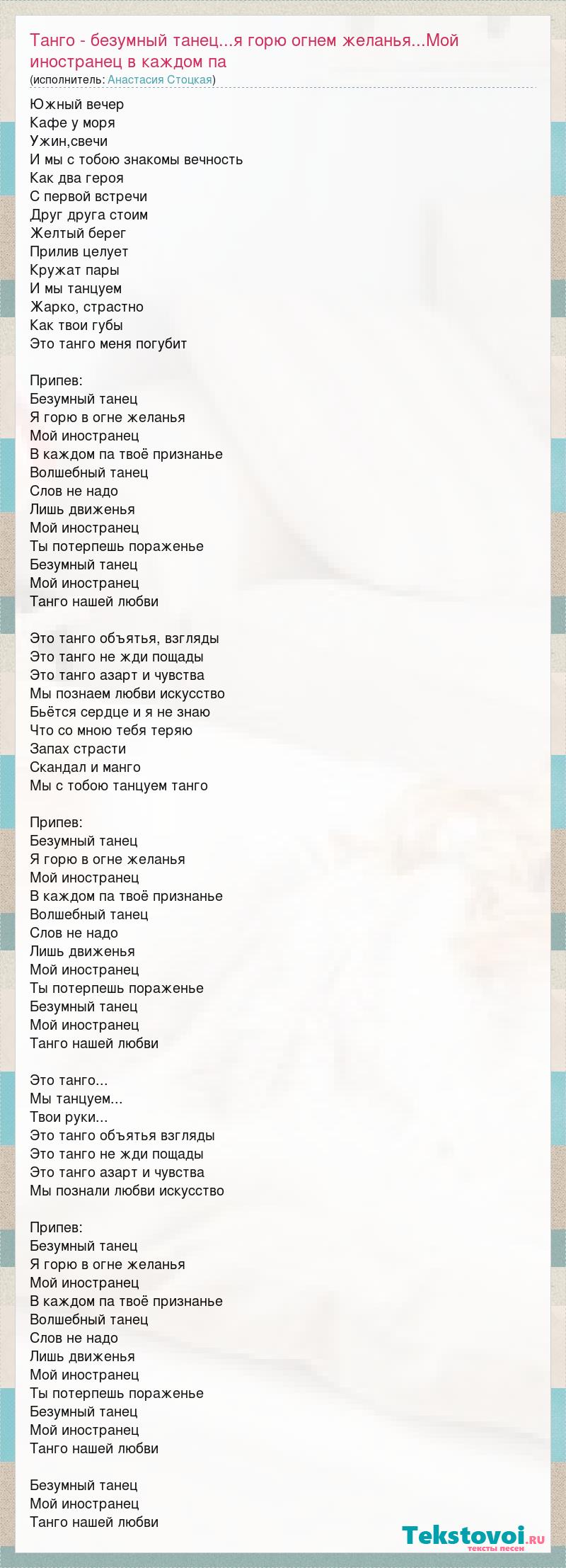 Южный вечер Кафе у моря Ужин,свечи И мы с тобою знакомы вечность Как два героя С первой встречи Друг друга стоим Желтый берег Прилив целует Кружат пары И мы танцуем Жарко, страстно Как твои губы Это танго меня погубит Припев: Безумный танец Я горю в огне желанья Мой иностранец В каждом па твоё признанье Волшебный танец Слов не надо Лишь движенья Мой иностранец Ты потерпешь пораженье Безумный танец Мой иностранец Танго нашей любви Это танго объятья, взгляды Это танго не жди пощады Это танго азарт и чувства Мы познаем любви искусство Бьётся сердце и я не знаю Что со мною тебя теряю Запах страсти Скандал и манго Мы с тобою танцуем танго Припев: Безумный танец Я горю в огне желанья Мой иностранец В каждом па твоё признанье Волшебный танец Слов не надо Лишь движенья Мой иностранец Ты потерпешь пораженье Безумный танец Мой иностранец Танго нашей любви Это танго... Мы танцуем... Твои руки... Это танго объятья взгляды Это танго не жди пощады Это танго азарт и чувства Мы познали любви искусство Припев: Безумный танец Я горю в огне желанья Мой иностранец В каждом па твоё признанье Волшебный танец Слов не надо Лишь движенья Мой иностранец Ты потерпешь пораженье Безумный танец Мой иностранец Танго нашей любви Безумный танец Мой иностранец Танго нашей любви
