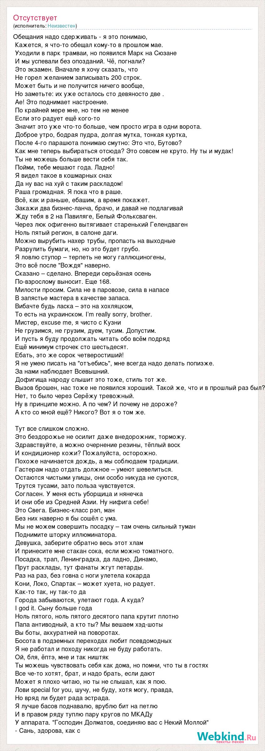 Обещания надо сдерживать - я это понимаю, Кажется, я что-то обещал кому-то в прошлом мае. Уходили в парк трамваи, но появился Марк на Сюзане И мы успевали без опозданий. Чё, погнали? Это экзамен. Вначале я хочу сказать, что Не горел желанием записывать 200 строк. Может быть и не получится ничего вообще, Но заметьте: их уже осталось сто девяносто две . Ае! Это поднимает настроение. По крайней мере мне, но тем не менее Если это радует ещё кого-то Значит это уже что-то больше, чем просто игра в одни ворота. Доброе утро, бодрая пудра, долгая мутка, тонкая куртка, После 4-го парашюта понимаю смутно: Это что, Бутово? Как мне теперь выбираться отсюда? Это совсем не круто. Ну ты и мудак! Ты не можешь больше вести себя так. Пойми, тебе мешают года. Ладно! Я видел такое в кошмарных снах Да ну вас на хуй с таким раскладом! Раша громадная. Я пока что в раше. Всё, как и раньше, ебашим, а время покажет. Закажи два бизнес-ланча, брачо, и давай не подлагивай Жду тебя в 2 на Павиляге, Белый Фольксваген. Через люк офигенно вытягивает старенький Гелендваген Ноль пятый регион, в салоне даги. Можно вырубить нахер трубы, пропасть на выходные Разрулить бумаги, но, но это будет грубо. Я ловлю ступор – терпеть не могу галлюциногены, Это всё после "Вождя" наверно. Сказано – сделано. Впереди серьёзная осень По-взрослому выносит. Еще 168. Милости просим. Сила не в паровозе, сила в напасе В запястье мастера в качестве запаса. Вибачте будь ласка – это на хохляцком, То есть на украинском. I’m really sorry, brother. Мистер, excuse me, я чисто с Кузни Не грузимся, не грузим, дуем, тусим. Допустим. И пусть я буду продолжать читать обо всём подряд Ещё минимум строчек сто шестьдесят. Ебать, это же сорок четверостиший! Я не умею писать на "отъебись", мне всегда надо делать попизже. За нами наблюдает Всевышний. Дофигища народу слышит это тоже, стиль тот же. Вызов брошен, нас тоже не появился хороший. Такой же, что и в прошлый раз был? Нет, то было через Серёжу тревожный. Ну в принципе можно. А по чем? И почему не дороже? А кто со мной ещё? Никого? Вот я о том же. Тут все слишком сложно. Это бездорожье не осилит даже внедорожник, торможу. Здравствуйте, а можно очернение резины, тёплый воск И кондиционер кожи? Пожалуйста, осторожно. Похоже начинается дождь, а мы соблюдаем традиции. Гастерам надо отдать должное – умеют шевелиться. Остаются чистыми улицы, они особо никуда не суются, Трутся тусами, зато польза чувствуется. Согласен. У меня есть уборщица и нянечка И они обе из Средней Азии. Ну нифига себе! Это Свега. Бизнес-класс рэп, ман Без них наверно я бы сошёл с ума. Мы не можем совершить посадку – там очень сильный туман Поднимите шторку иллюминатора. Девушка, заберите обратно весь этот хлам И принесите мне стакан сока, если можно томатного. Посадка, трап, Ленинградка, да ладно, Динамо, Прут расклады, тут фанаты жгут петарды. Раз на раз, без говна с ноги улетела кокарда Кони, Локо, Спартак – может хуета, но радует. Как-то так, ну так-то да Города забываются, улетают года. А куда? I god it. Сыну больше года Ноль пятого, ноль пятого десятого папа крутит плотно Папа антиводный, а кто ты? Мы вешаем хэд-шоты Вы боты, аккуратней на поворотах. Босота в подземных переходах любит псевдомодных Я не работал и походу никогда не буду работать. Ой, бля, ёптэ, мне и так ништяк Ты можешь чувствовать себя как дома, но помни, что ты в гостях Все че-то хотят, брат, и надо бр