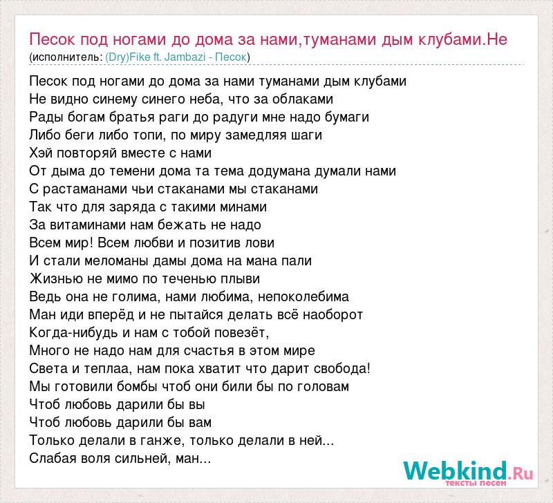 Главная→Исполнители→(Dry)Fike ft. Jambazi - Песок→Песок под ногами до дома за нами,туманами дым клубами.Не