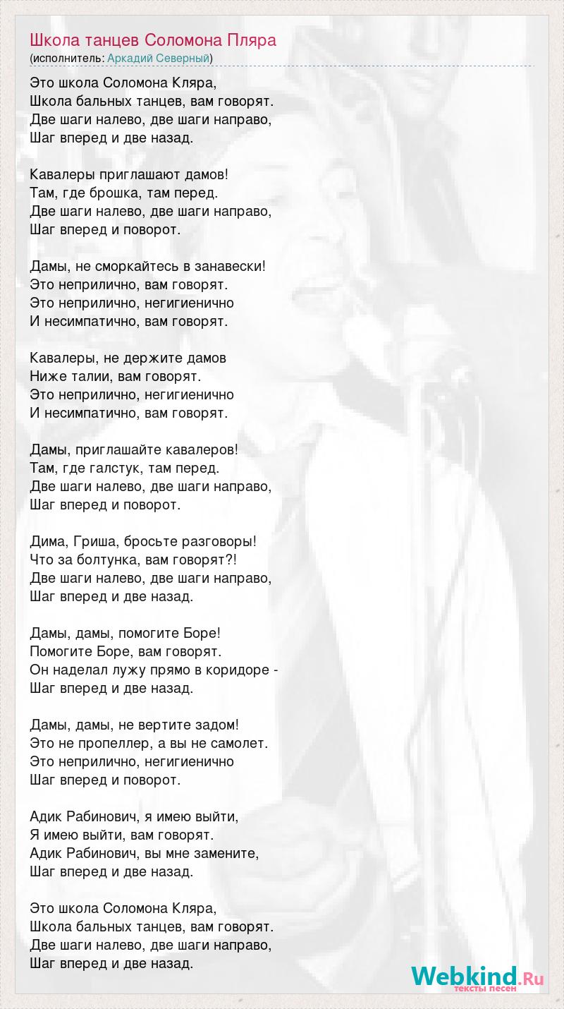 Это школа Соломона Кляра, Школа бальных танцев, вам говорят. Две шаги налево, две шаги направо, Шаг вперед и две назад. Кавалеры приглашают дамов! Там, где брошка, там перед. Две шаги налево, две шаги направо, Шаг вперед и поворот. Дамы, не сморкайтесь в занавески! Это неприлично, вам говорят. Это неприлично, негигиенично И несимпатично, вам говорят. Кавалеры, не держите дамов Ниже талии, вам говорят. Это неприлично, негигиенично И несимпатично, вам говорят. Дамы, приглашайте кавалеров! Там, где галстук, там перед. Две шаги налево, две шаги направо, Шаг вперед и поворот. Дима, Гриша, бросьте разговоры! Что за болтунка, вам говорят?! Две шаги налево, две шаги направо, Шаг вперед и две назад. Дамы, дамы, помогите Боре! Помогите Боре, вам говорят. Он наделал лужу прямо в коридоре - Шаг вперед и две назад. Дамы, дамы, не вертите задом! Это не пропеллер, а вы не самолет. Это неприлично, негигиенично Шаг вперед и поворот. Адик Рабинович, я имею выйти, Я имею выйти, вам говорят. Адик Рабинович, вы мне замените, Шаг вперед и две назад. Это школа Соломона Кляра, Школа бальных танцев, вам говорят. Две шаги налево, две шаги направо, Шаг вперед и две назад.