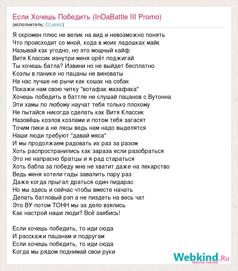 Я скромен плюс не велик на вид и невозможно понять Что происходит со мной, кода в моих ладошках майк Называй как угодно, но это мощный кайф Витя Классик изнутри меня орёт поджигай Ты хочешь батла? Извини но не выйдет бесплатно Козлы в панике но пацаны не виноваты На нас лучше не рычи как кошак на собак Покажи нам свою читку "вотафак мазафака" Хочешь победить в баттле не слушай пацанов с Вутонна Эти хамы по любому научат тебя только плохому Не пытайся никогда сделать как Витя Классик Назовёшь козлов козлами и потом тебя загасят Точим пики а не лясы ведь нам надо выделятся Наши люди требуют "давай мяса" И мы продолжаем радовать их раз за разом Хоть распространились как зараза если разобраться Это не напрасно братцы и я рад стараться Хоть бабла за победу мне не хватит даже на лекарство Ведь меня хотели гады завалить пару раз Даже когда прыгал драться один пидарас Но мы здесь и сейчас чтобы вместе начать Делать батловый рэп а не пиздеть на весь чат Это ВУ потом ТОНН мы за дело взялись Как настрой наши люди? Всё заебись! Если хочешь победить, то иди сюда И расскажи пацанам и подругам Если хочешь победить, то иди сюда Когда мы рядом поднимай свои руки
