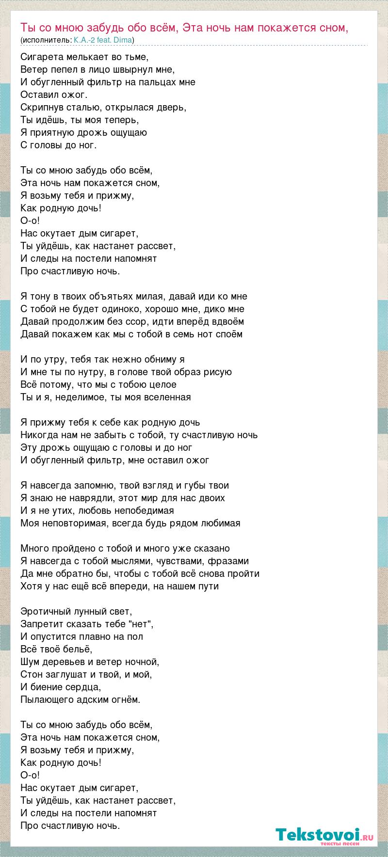 Сигарета мелькает во тьме, Ветер пепел в лицо швырнул мне, И обугленный фильтр на пальцах мне Оставил ожог. Скрипнув сталью, открылася дверь, Ты идёшь, ты моя теперь, Я приятную дрожь ощущаю С головы до ног. Ты со мною забудь обо всём, Эта ночь нам покажется сном, Я возьму тебя и прижму, Как родную дочь! О-о! Hас окутает дым сигарет, Ты уйдёшь, как настанет рассвет, И следы на постели напомнят Про счастливую ночь. Я тону в твоих объятьях милая, давай иди ко мне С тобой не будет одиноко, хорошо мне, дико мне Давай продолжим без ссор, идти вперёд вдвоём Давай покажем как мы с тобой в семь нот споём И по утру, тебя так нежно обниму я И мне ты по нутру, в голове твой образ рисую Всё потому, что мы с тобою целое Ты и я, неделимое, ты моя вселенная Я прижму тебя к себе как родную дочь Никогда нам не забыть с тобой, ту счастливую ночь Эту дрожь ощущаю с головы и до ног И обугленный фильтр, мне оставил ожог Я навсегда запомню, твой взгляд и губы твои Я знаю не наврядли, этот мир для нас двоих И я не утих, любовь непобедимая Моя неповторимая, всегда будь рядом любимая Много пройдено с тобой и много уже сказано Я навсегда с тобой мыслями, чувствами, фразами Да мне обратно бы, чтобы с тобой всё снова пройти Хотя у нас ещё всё впереди, на нашем пути Эротичный лунный свет, Запретит сказать тебе "нет", И опустится плавно на пол Всё твоё бельё, Шум деревьев и ветер ночной, Стон заглушат и твой, и мой, И биение сердца, Пылающего адским огнём. Ты со мною забудь обо всём, Эта ночь нам покажется сном, Я возьму тебя и прижму, Как родную дочь! О-о! Hас окутает дым сигарет, Ты уйдёшь, как настанет рассвет, И следы на постели напомнят Про счастливую ночь.