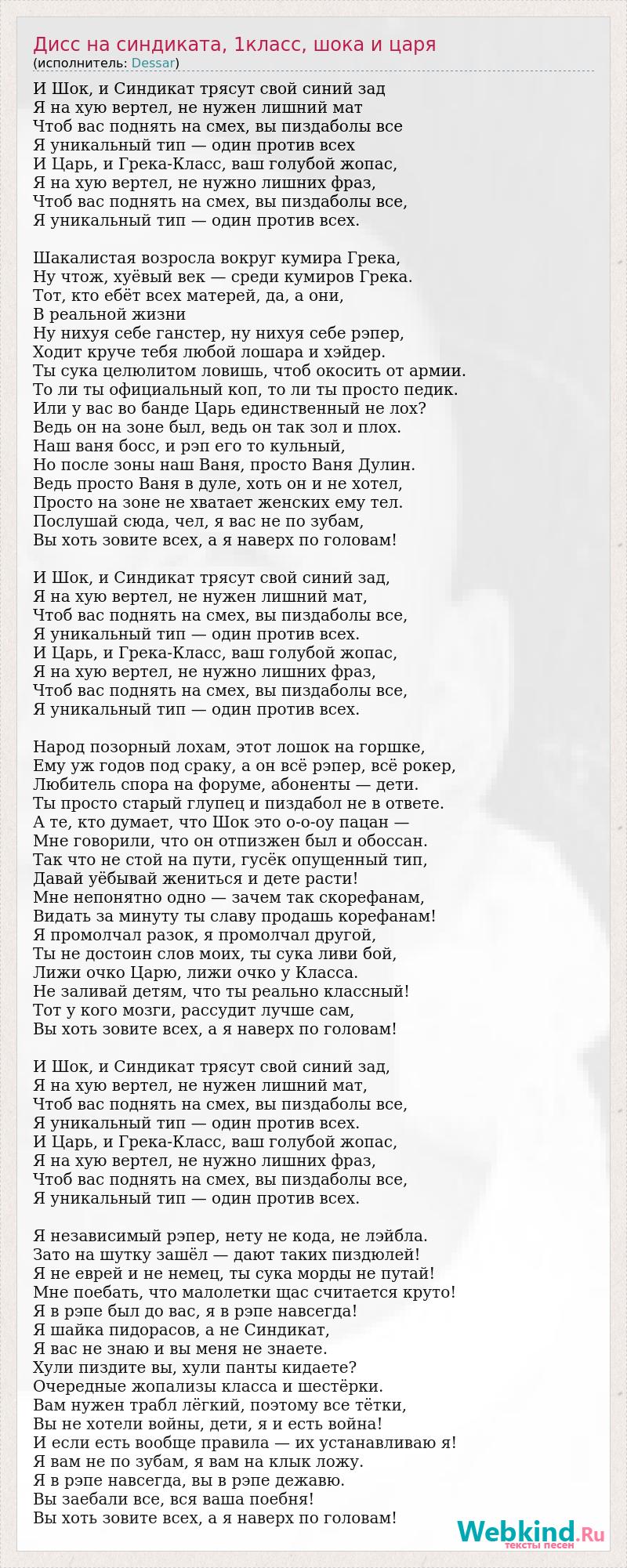 И Шок, и Синдикат трясут свой синий зад Я на хую вертел, не нужен лишний мат Чтоб вас поднять на смех, вы пиздаболы все Я уникальный тип — один против всех И Царь, и Грека-Класс, ваш голубой жопас, Я на хую вертел, не нужно лишних фраз, Чтоб вас поднять на смех, вы пиздаболы все, Я уникальный тип — один против всех. Шакалистая возросла вокруг кумира Грека, Ну чтож, хуёвый век — среди кумиров Грека. Тот, кто ебёт всех матерей, да, а они, В реальной жизни Ну нихуя себе ганстер, ну нихуя себе рэпер, Ходит круче тебя любой лошара и хэйдер. Ты сука целюлитом ловишь, чтоб окосить от армии. То ли ты официальный коп, то ли ты просто педик. Или у вас во банде Царь единственный не лох? Ведь он на зоне был, ведь он так зол и плох. Наш ваня босс, и рэп его то кульный, Но после зоны наш Ваня, просто Ваня Дулин. Ведь просто Ваня в дуле, хоть он и не хотел, Просто на зоне не хватает женских ему тел. Послушай сюда, чел, я вас не по зубам, Вы хоть зовите всех, а я наверх по головам! И Шок, и Синдикат трясут свой синий зад, Я на хую вертел, не нужен лишний мат, Чтоб вас поднять на смех, вы пиздаболы все, Я уникальный тип — один против всех. И Царь, и Грека-Класс, ваш голубой жопас, Я на хую вертел, не нужно лишних фраз, Чтоб вас поднять на смех, вы пиздаболы все, Я уникальный тип — один против всех. Народ позорный лохам, этот лошок на горшке, Ему уж годов под сраку, а он всё рэпер, всё рокер, Любитель спора на форуме, абоненты — дети. Ты просто старый глупец и пиздабол не в ответе. А те, кто думает, что Шок это о-о-оу пацан — Мне говорили, что он отпизжен был и обоссан. Так что не стой на пути, гусёк опущенный тип, Давай уёбывай жениться и дете расти! Мне непонятно одно — зачем так скорефанам, Видать за минуту ты славу продашь корефанам! Я промолчал разок, я промолчал другой, Ты не достоин слов моих, ты сука ливи бой, Лижи очко Царю, лижи очко у Класса. Не заливай детям, что ты реально классный! Тот у кого мозги, рассудит лучше сам, Вы хоть зовите всех, а я наверх по головам! И Шок, и Синдикат трясут свой синий зад, Я на хую вертел, не нужен лишний мат, Чтоб вас поднять на смех, вы пиздаболы все, Я уникальный тип — один против всех. И Царь, и Грека-Класс, ваш голубой жопас, Я на хую вертел, не нужно лишних фраз, Чтоб вас поднять на смех, вы пиздаболы все, Я уникальный тип — один против всех. Я независимый рэпер, нету не кода, не лэйбла. Зато на шутку зашёл — дают таких пиздюлей! Я не еврей и не немец, ты сука морды не путай! Мне поебать, что малолетки щас считается круто! Я в рэпе был до вас, я в рэпе навсегда! Я шайка пидорасов, а не Синдикат, Я вас не знаю и вы меня не знаете. Хули пиздите вы, хули панты кидаете? Очередные жопализы класса и шестёрки. Вам нужен трабл лёгкий, поэтому все тётки, Вы не хотели войны, дети, я и есть война! И если есть вообще правила — их устанавливаю я! Я вам не по зубам, я вам на клык ложу. Я в рэпе навсегда, вы в рэпе дежавю. Вы заебали все, вся ваша поебня! Вы хоть зовите всех, а я наверх по головам!