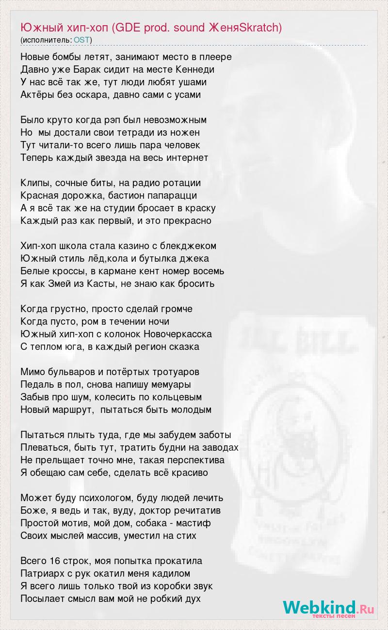 Новые бомбы летят, занимают место в плеере Давно уже Барак сидит на месте Кеннеди У нас всё так же, тут люди любят ушами Актёры без оскара, давно сами с усами Было круто когда рэп был невозможным Но мы достали свои тетради из ножен Тут читали-то всего лишь пара человек Теперь каждый звезда на весь интернет Клипы, сочные биты, на радио ротации Красная дорожка, бастион папарацци А я всё так же на студии бросает в краску Каждый раз как первый, и это прекрасно Хип-хоп школа стала казино с блекджеком Южный стиль лёд,кола и бутылка джека Белые кроссы, в кармане кент номер восемь Я как Змей из Касты, не знаю как бросить Когда грустно, просто сделай громче Когда пусто, ром в течении ночи Южный хип-хоп с колонок Новочеркасска С теплом юга, в каждый регион сказка Мимо бульваров и потёртых тротуаров Педаль в пол, снова напишу мемуары Забыв про шум, колесить по кольцевым Новый маршрут, пытаться быть молодым Пытаться плыть туда, где мы забудем заботы Плеваться, быть тут, тратить будни на заводах Не прельщает точно мне, такая перспектива Я обещаю сам себе, сделать всё красиво Может буду психологом, буду людей лечить Боже, я ведь и так, вуду, доктор речитатив Простой мотив, мой дом, собака - мастиф Своих мыслей массив, уместил на стих Всего 16 строк, моя попытка прокатила Патриарх с рук окатил меня кадилом Я всего лишь только твой из коробки звук Посылает смысл вам мой не робкий дух