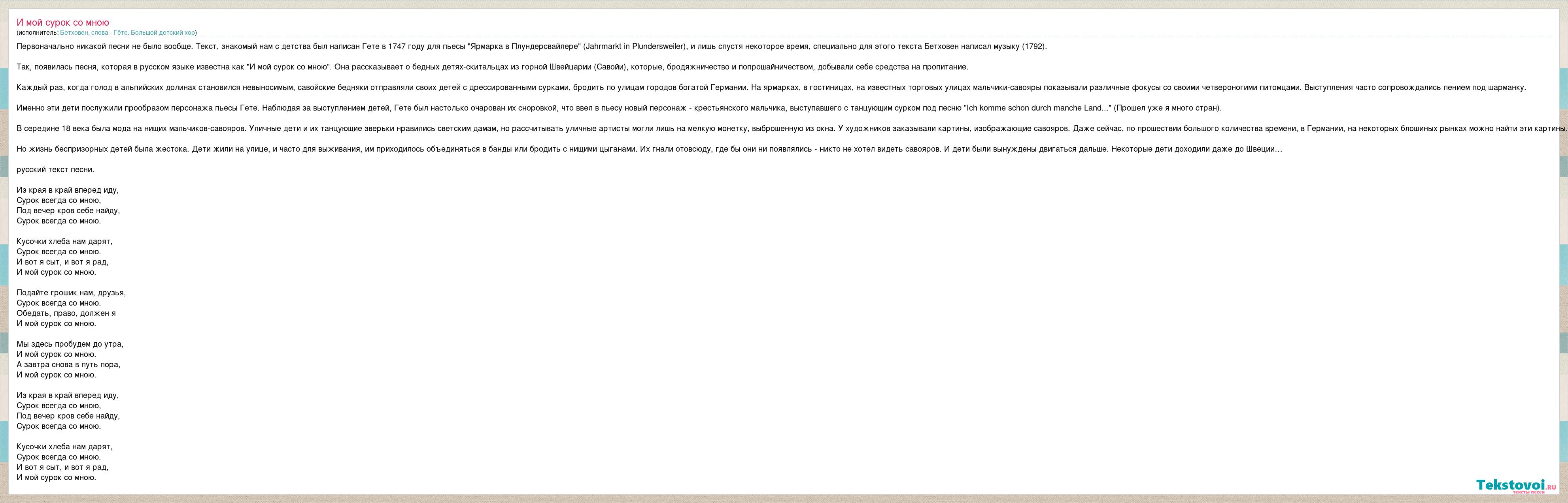 Первоначально никакой песни не было вообще. Текст, знакомый нам с детства был написан Гете в 1747 году для пьесы "Ярмарка в Плундерсвайлере" (Jahrmarkt in Plundersweiler), и лишь спустя некоторое время, специально для этого текста Бетховен написал музыку (1792). Так, появилась песня, которая в русском языке известна как "И мой сурок со мною". Она рассказывает о бедных детях-скитальцах из горной Швейцарии (Савойи), которые, бродяжничество и попрошайничеством, добывали себе средства на пропитание. Каждый раз, когда голод в альпийских долинах становился невыносимым, савойские бедняки отправляли своих детей с дрессированными сурками, бродить по улицам городов богатой Германии. На ярмарках, в гостиницах, на известных торговых улицах мальчики-савояры показывали различные фокусы со своими четвероногими питомцами. Выступления часто сопровождались пением под шарманку. Именно эти дети послужили прообразом персонажа пьесы Гете. Наблюдая за выступлением детей, Гете был настолько очарован их сноровкой, что ввел в пьесу новый персонаж - крестьянского мальчика, выступавшего с танцующим сурком под песню "Ich komme schon durch manche Land..." (Прошел уже я много стран). В середине 18 века была мода на нищих мальчиков-савояров. Уличные дети и их танцующие зверьки нравились светским дамам, но рассчитывать уличные артисты могли лишь на мелкую монетку, выброшенную из окна. У художников заказывали картины, изображающие савояров. Даже сейчас, по прошествии большого количества времени, в Германии, на некоторых блошиных рынках можно найти эти картины. Но жизнь беспризорных детей была жестока. Дети жили на улице, и часто для выживания, им приходилось объединяться в банды или бродить с нищими цыганами. Их гнали отовсюду, где бы они ни появлялись - никто не хотел видеть савояров. И дети были вынуждены двигаться дальше. Некоторые дети доходили даже до Швеции… русский текст песни. Из края в край вперед иду, Сурок всегда со мною, Под вечер кров себе найду, Сурок всегда со мною. Кусочки хлеба нам дарят, Сурок всегда со мною. И вот я сыт, и вот я рад, И мой сурок со мною. Подайте грошик нам, друзья, Сурок всегда со мною. Обедать, право, должен я И мой сурок со мною. Мы здесь пробудем до утра, И мой сурок со мною. А завтра снова в путь пора, И мой сурок со мною. Из края в край вперед иду, Сурок всегда со мною, Под вечер кров себе найду, Сурок всегда со мною. Кусочки хлеба нам дарят, Сурок всегда со мною. И вот я сыт, и вот я рад, И мой сурок со мною.