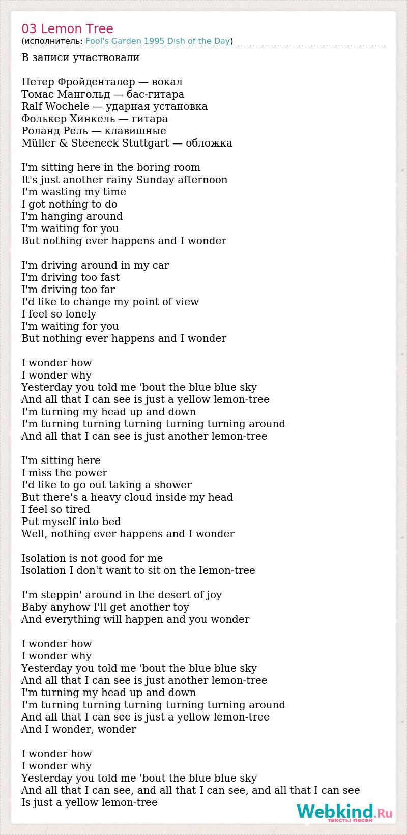 В записи участвовали Петер Фройденталер — вокал Томас Мангольд — бас-гитара Ralf Wochele — ударная установка Фолькер Хинкель — гитара Роланд Рель — клавишные Müller & Steeneck Stuttgart — обложка I'm sitting here in the boring room It's just another rainy Sunday afternoon I'm wasting my time I got nothing to do I'm hanging around I'm waiting for you But nothing ever happens and I wonder I'm driving around in my car I'm driving too fast I'm driving too far I'd like to change my point of view I feel so lonely I'm waiting for you But nothing ever happens and I wonder I wonder how I wonder why Yesterday you told me 'bout the blue blue sky And all that I can see is just a yellow lemon-tree I'm turning my head up and down I'm turning turning turning turning turning around And all that I can see is just another lemon-tree I'm sitting here I miss the power I'd like to go out taking a shower But there's a heavy cloud inside my head I feel so tired Put myself into bed Well, nothing ever happens and I wonder Isolation is not good for me Isolation I don't want to sit on the lemon-tree I'm steppin' around in the desert of joy Baby anyhow I'll get another toy And everything will happen and you wonder I wonder how I wonder why Yesterday you told me 'bout the blue blue sky And all that I can see is just another lemon-tree I'm turning my head up and down I'm turning turning turning turning turning around And all that I can see is just a yellow lemon-tree And I wonder, wonder I wonder how I wonder why Yesterday you told me 'bout the blue blue sky And all that I can see, and all that I can see, and all that I can see Is just a yellow lemon-tree