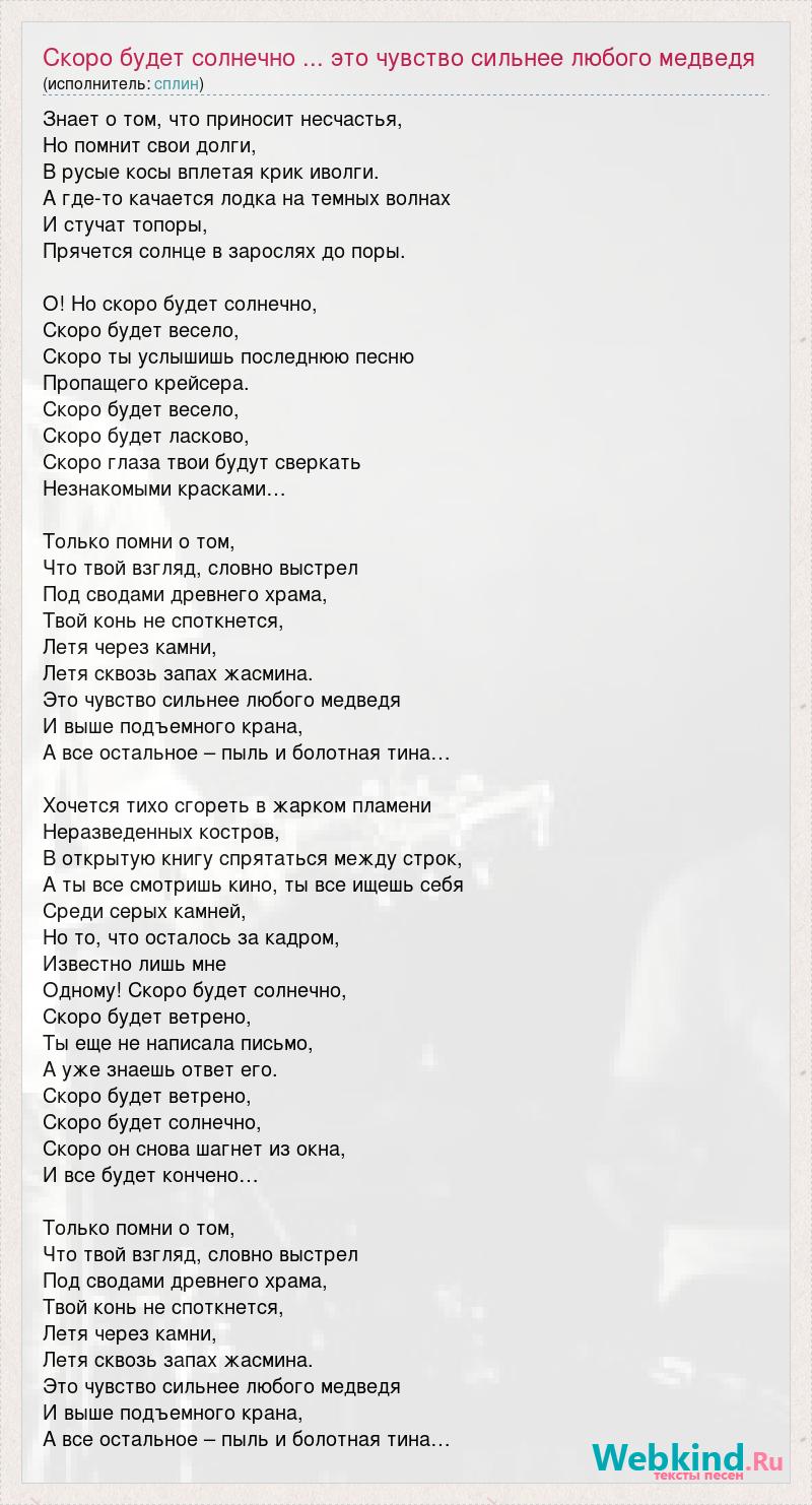 Главная→Исполнители→Сплин→Скоро будет солнечно ... это чувство сильнее любого медведя и выше подъемного к