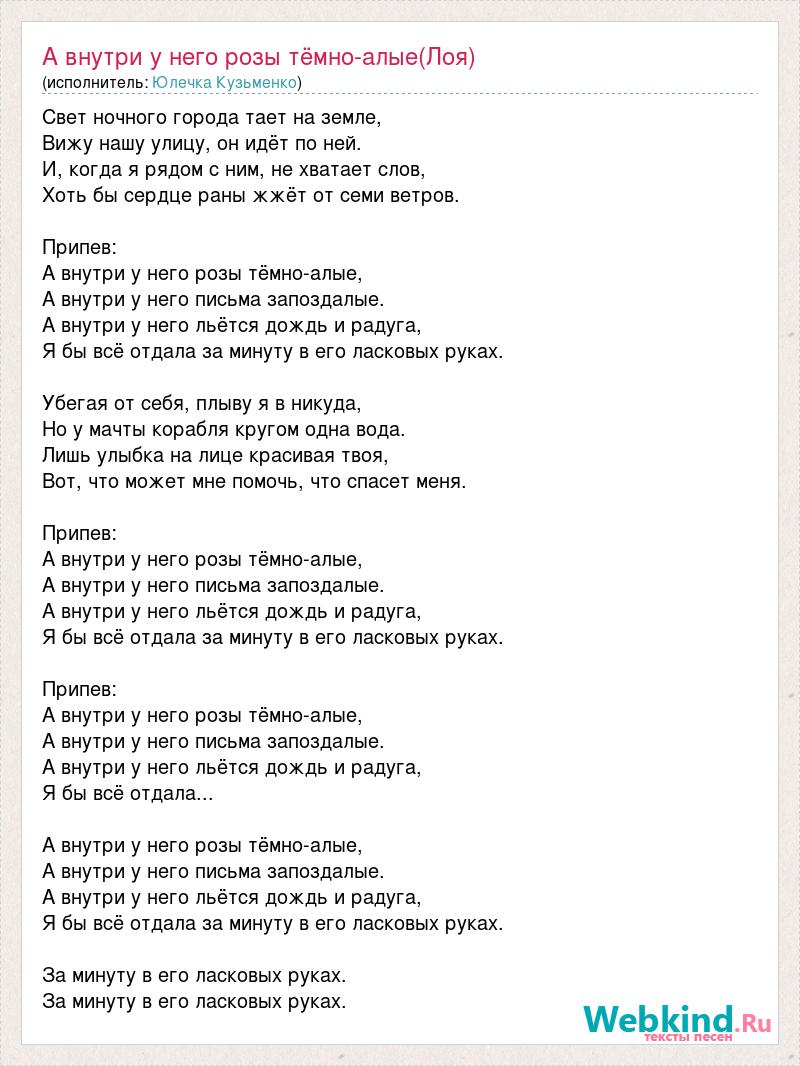 Свет ночного города тает на земле, Вижу нашу улицу, он идёт по ней. И, когда я рядом с ним, не хватает слов, Хоть бы сердце раны жжёт от семи ветров. Припев: А внутри у него розы тёмно-алые, А внутри у него письма запоздалые. А внутри у него льётся дождь и радуга, Я бы всё отдала за минуту в его ласковых руках. Убегая от себя, плыву я в никуда, Но у мачты корабля кругом одна вода. Лишь улыбка на лице красивая твоя, Вот, что может мне помочь, что спасет меня. Припев: А внутри у него розы тёмно-алые, А внутри у него письма запоздалые. А внутри у него льётся дождь и радуга, Я бы всё отдала за минуту в его ласковых руках. Припев: А внутри у него розы тёмно-алые, А внутри у него письма запоздалые. А внутри у него льётся дождь и радуга, Я бы всё отдала... А внутри у него розы тёмно-алые, А внутри у него письма запоздалые. А внутри у него льётся дождь и радуга, Я бы всё отдала за минуту в его ласковых руках. За минуту в его ласковых руках. За минуту в его ласковых руках.